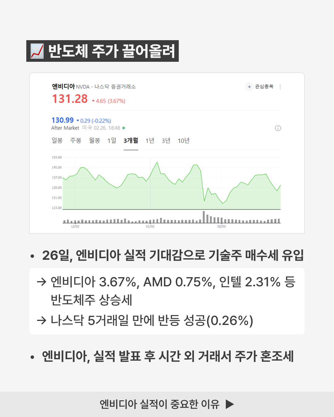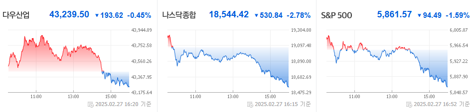โ๏ธ2์ 27์ผ, ๋ฐ๋ฑ์ธ๋ฅผ ์ด์ด๊ฐ๋ ๋ค์ฐ์ง์๋ ์ ์ฅ๋ณด๋ค 0.45% ํ๋ฝ ๋ง๊ฐํ๋ฉฐ ์ดํ ์งธํ๋ฝ. ์ ๋ , ๋ท์ ๋ง์ ๋ฐ๋ฑ์ ์ฑ๊ณตํ๋ S&P500์ง์์ ๋์ค๋ฅ์ง์๋ ๊ฐ๊ฐ ์ ์ฅ๋ณด๋ค 1.59%, 2.78% ๊ธ๋ฝ