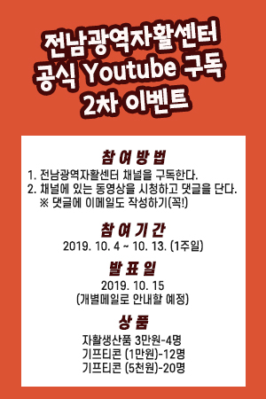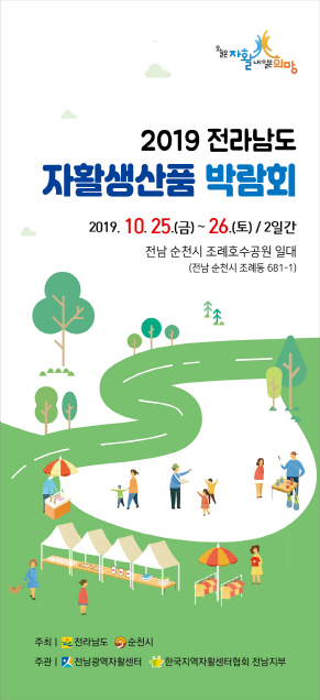![]() 2019 전라남도 자활생산품 박람회 10월 25~26일은 순천 조례호수공원으로 오세요~~^^ 2019년 전라남도 자활생산품 박람회가 10월 25일 금요일부터 10월 26일 토요일까지 1박2일동안 순천시 조례호수공원 일대에서 개최할 예정이다. 이번 행사는 전남 23개 지역자활센터가 함께 참여하는 최대 규모의 행사로 전라남도와 순천시가 주최하고 전남광역자활센터와 한국지역자활센터협회 전남지부가 주관하는 이번 행사에서는 전남의 우수한 자활생산품을 일반 시민에게 소개하고 다채로운 행사를 마련하여 시민과 함께할 계획이다. 10월 일정 안내 □ 2019 전라남도 생산품 박람회 ○ 기 간 : 2019. 10. 25. (금) ~ 2019. 10. 26. (토) / 2일간 ○ 장 소 : 순천 조례호수공원 일대 (전남 순천시 조례동 681-1) □ 2019 전라남도 자활대회 ○ 기 간 : 2019. 10. 25. (금) ○ 장 소 : 순천 조례호수공원 일대 (전남 순천시 조례동 681-1) □ 2019 전남 자활 중간관리자 과정 ○ 기 간 : 2019. 10. 25. (금) ○ 장 소 : 순천 조례호수공원 일대 (전남 순천시 조례동 681-1) ○ 일 시 : 2019. 10. 10(목)~11.(금) ○ 장 소 : 완도해조류스파랜드 ○ 주최/주관 : 전남광역자활센터 ○ 협 조 : 한국지역자활센터 협회 전남지부 □ 참여주민 경영시뮬레이션 2기 ○ 일 시 : 2019. 10. 14.(월) 13:30 ~ 17:30