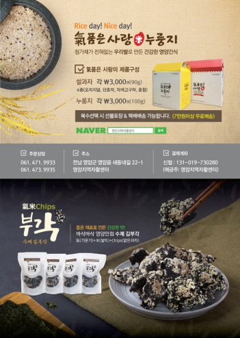 우리 사업단을 소개합니다. " 나눔봉사를 실천하고 있습니다. " 매년 왕인문화축제기간동안 “이웃사랑기금마련바자회” 행사를 통해 발생한 수익금으로 경제적으로 취약한 홀로사는 어르신들에게 반찬서비스를 제공하여 소외된 이웃들에게 사랑과 나눔봉사를 행함으로 지역사회 복지향상에 크게 기여하고 있고. 지역내 여러 봉사단체와 함께 매년 ‘사랑의 김장나누기행사’를 통해 참여주민들이 직접 재배한 배추 5,000여 포기로 김장하여 관내 독거노인, 결식아동, 장애인가정등 600여세대에 전달하여 자활참여주민에게 나눔과 협동심을 고취시키고 함께 사는 지역공동체를 만들어가는데 앞장서고 있습니다. 또한, 지역특화사업으로 추진중인 만능수리인이동서비스를 통해 사회취약계층(독거노인, 기초수급자, 차상위, 장애인 등)에게 스스로 해결하기 어려운 소소한 생활민원(전구, 콘센트, 스위치, 문고리, 수도꼭지, 방충망 수리 및 교체)를 해결해 주어 관내 취약계층의 생활불편을 해소하는 맞춤형 서비스로 높은 평가를 받아 추진중이다. ![]() 자활생산품을 소개합니다. 2018년부터 첨가물없이 100% 우리쌀로 직접 만든 건강먹거리 간식 누룽지와 영양쌀과자를 만들어 판매중이고, 2019년 시범사업으로 바삭바삭한 영양만점 수제김부각을 만들어 판매중이다. (쌀과자 4종(오리지널,단호박,자색고구마,혼합) 각 3,000원 / 누룽지 각 3,000원 문의 : 061.471.9933, 061.473.9935)