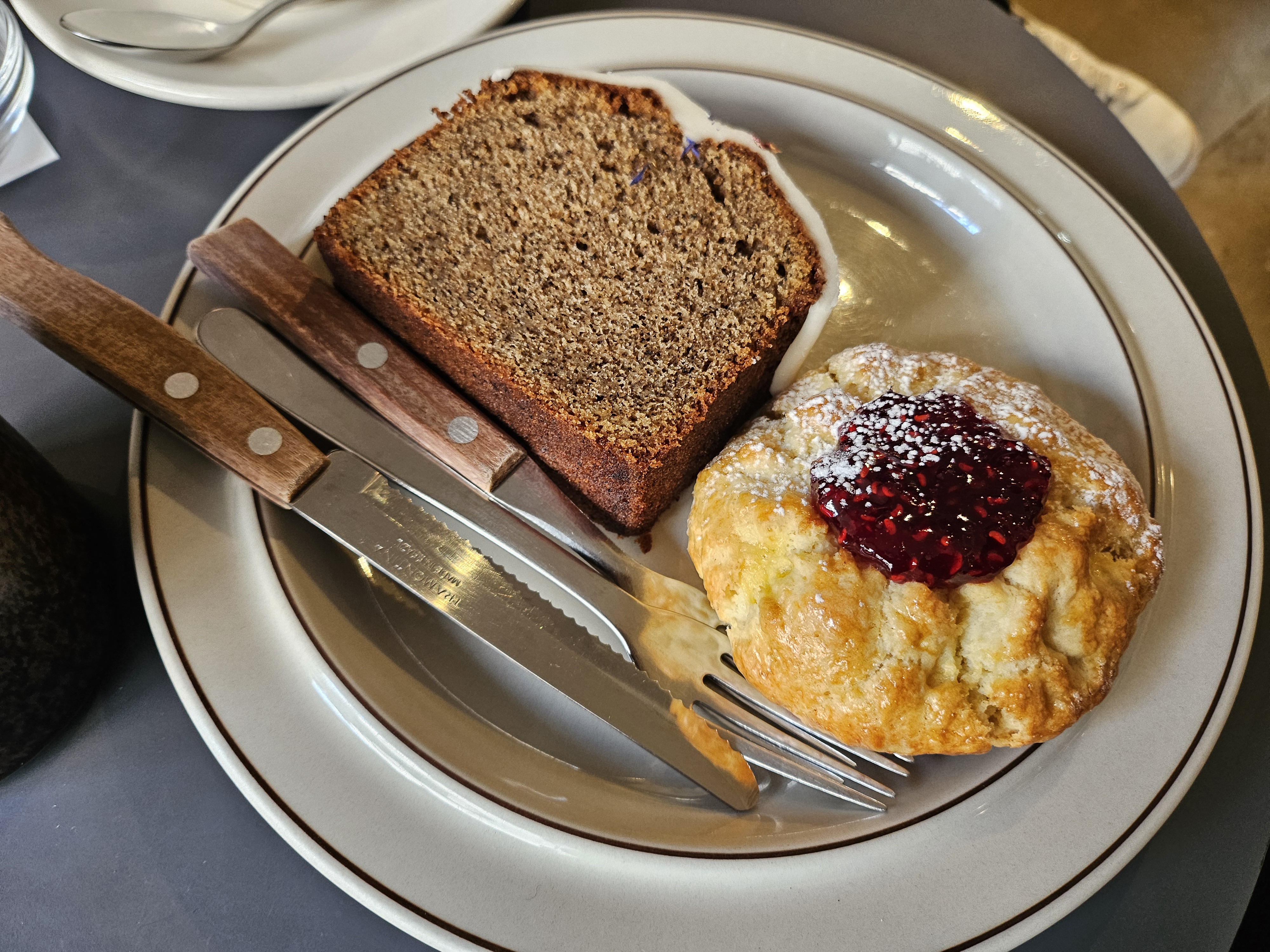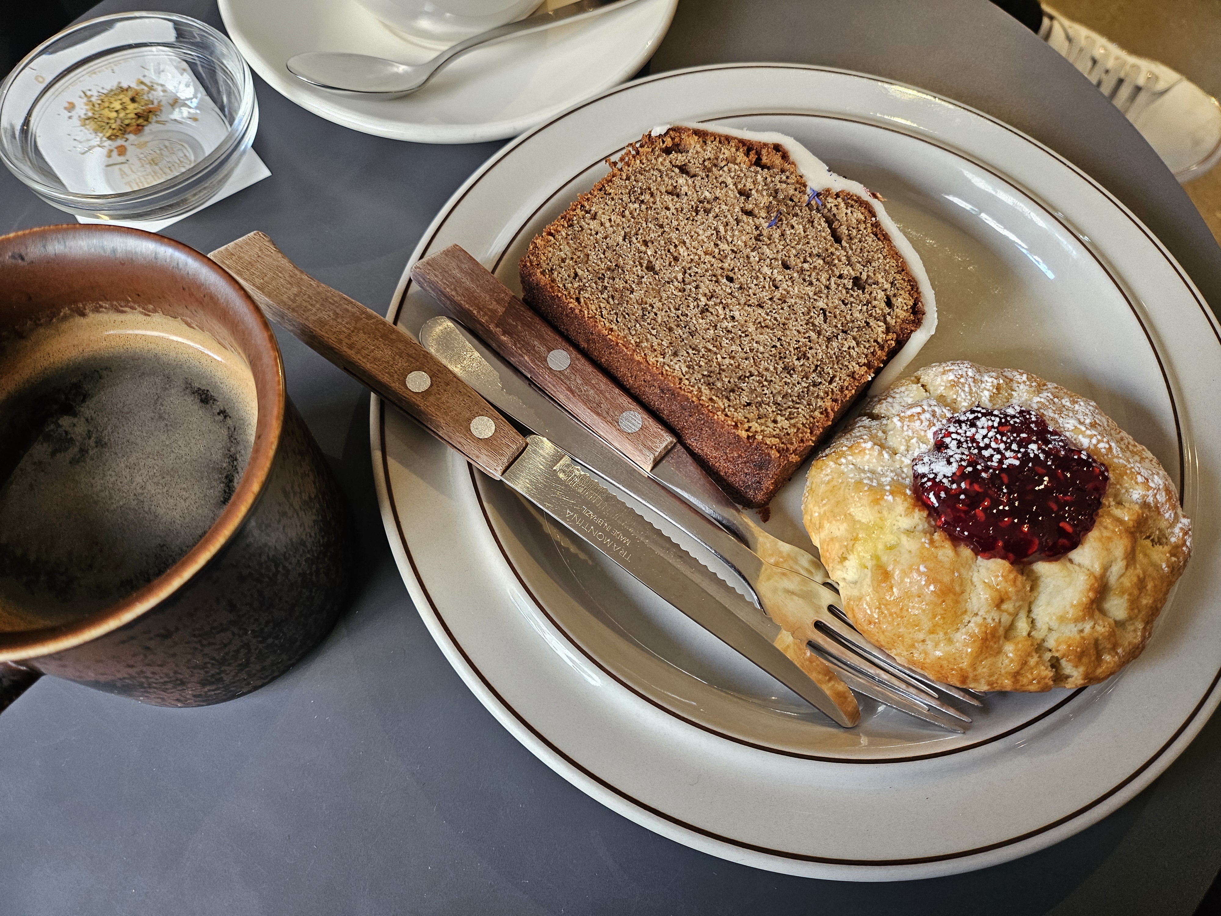 라즈베리스콘은 홈메이드 느낌이라 좋았습니다. 집에서 만든 듯한 느낌의 라즈베리잼이 스콘 가운데에 듬뿍 들어가 있었는데요. 라즈베리 씨드 특유의 식감과 새콤한 맛이 잘 느껴지는 잼이었어요. 스콘도 밀가루 맛이 나지 않는, 겉바속촉 느낌을 잘 살린 스콘이었습니다. 간혹 밀가루 맛이 세게 나는 스콘들이 있는데, 그런 밀가루 비린내를 전혀 느낄 수 없어서 좋았어요. 라즈베리잼에 스콘 조합은 그 누구도 무시할 수 없는 조합이기도 하고요!