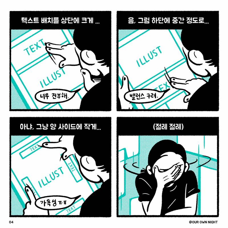 ธ๋ ฅํ์ต๋๋ค. ์์ ์ ์ผ๋ก๋ ๊ทธ๋ฆผ๊ณผ ๊ธ์ด ์๋ก๋ฅผ ๋ฐฉํดํ์ง ์๊ณ ์๊ฐ์ ์ผ๋ก ์กฐํ๋กญ๊ฒ ๋ด๊ธธ ์ ์๋ ๋ ์ด์์์ ์ฐพ์ผ๋ ค๊ณ ๋ง์ด ๊ณ ๋ฏผํ๋ฉด์ ๋ง๋ค์๋ ๊ฒ ๊ฐ์ต๋๋ค." ๐์กฐ๊ธ ์ด์ํด๋, ๋ถ์กฑํด๋ ๊ด์ฐฎ์ "์ ๋ ํญ์ ๋๋ง์ ๋ฌด์ธ๊ฐ๋ฅผ ๋ง๋ค๊ณ ์ถ๋ค๋ ์ด๋ง์ ๊ฐ๊ณ ์์์ง๋ง, ๊ทธ ์์์ด ๋ ์ด๋ ค์ ์ด์. ์๋ง ์ ์ ๋น์ทํ ๋ถ๋ค์ด ๋ง์ ๊ฑฐ๋ผ๊ณ ์๊ฐํด์. ๊ทธ๋ฐ๋ฐ ์ด๋ฒ์ ์์