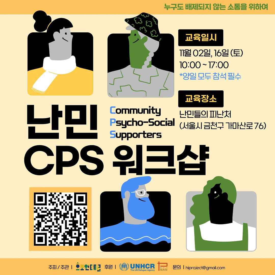 - 2024년 하반기 지역사회 난민들을 위한 심리사회지원 서포터즈(Community Psychosocial Supporters) 워크샵 (with 유엔난민기구, 국제난민지원 피난처, 11월 2일, 16일) |