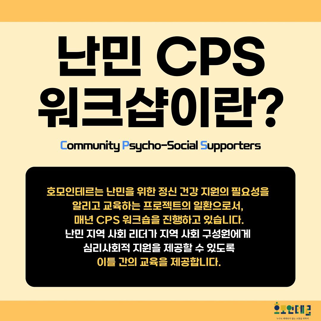 오늘은 지역사회 차원의 정신건강 및 심리·사회적 지원 활동 사례를 몇 가지 소개해드리려 하는데요. 첫 번째 사례는 호모인테르의 'Community Psycho-Social Supporters Training Workshop(CPS)' 워크숍입니다!
