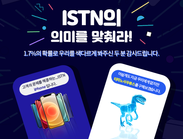 지난 호에서 뉴스레터 발간 기념으로 ISTN의 의미를 맞추는 이벤트를 진행했습니다. 총 118분이 참여해주셨으며, 116분께서 정답을 맞춰 주셨습니다. 정답은 다음과 같습니다. ①ISTN provides the best ②Solutions to satisfy hidden needs of customer through new ③Technology and ④Network 그리고 의외의 오답도 있었습니다. 안타깝게 탈락하신 분들께 아쉬운 마음과 함께 심심한 위로를 드립니다. ^^ 아래 오답입니다. | ISTN 이 아닌 iPhone: