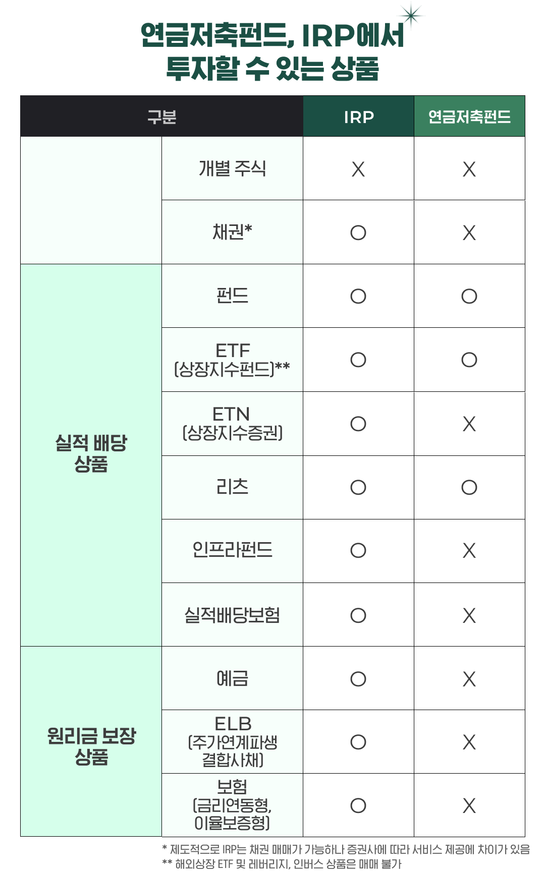 ํ๋๋์ ๋ฐ๋ผ ํฌ์ ๊ฐ๋ฅํ ์ํ๊ตฐ์ด ์กฐ๊ธ์ฉ ์ฐจ์ด๊ฐ ์๊ธฐ ๋๋ฌธ์ธ๋ฐ์. ๊ธ์ต์ฌ ์ค ์ฆ๊ถ์ฌ IRP๊ฐ ๋ค์ํ ์ ํ๊ถ์ ์ ๊ณตํ๋ ํธ์ด์์. ์ํ์ ์๊ธ๊ณผ ํ๋๋ฅผ ์ค์ฌ์ผ๋ก ์ด์๋๋ฉฐ, ETF๋ ์ผ๋ถ ๊ฐ๋ฅํ์ง๋ง ์ค์๊ฐ ๊ฑฐ๋์๋ ์ ์ฝ์ด ์์ ์ ์์ด์. ๋ณดํ์ฌ๋ ๊ธ๋ฆฌํ ๋ณดํ๊ณผ ํ๋ ์์ฃผ๋ก, ์์ฐ ๊ตฌ์ฑ์ ๋ค์์ฑ์ ๋ค์ ์ ํ์ ์ด๋ ์ฐธ๊ณ ํ์ธ์.