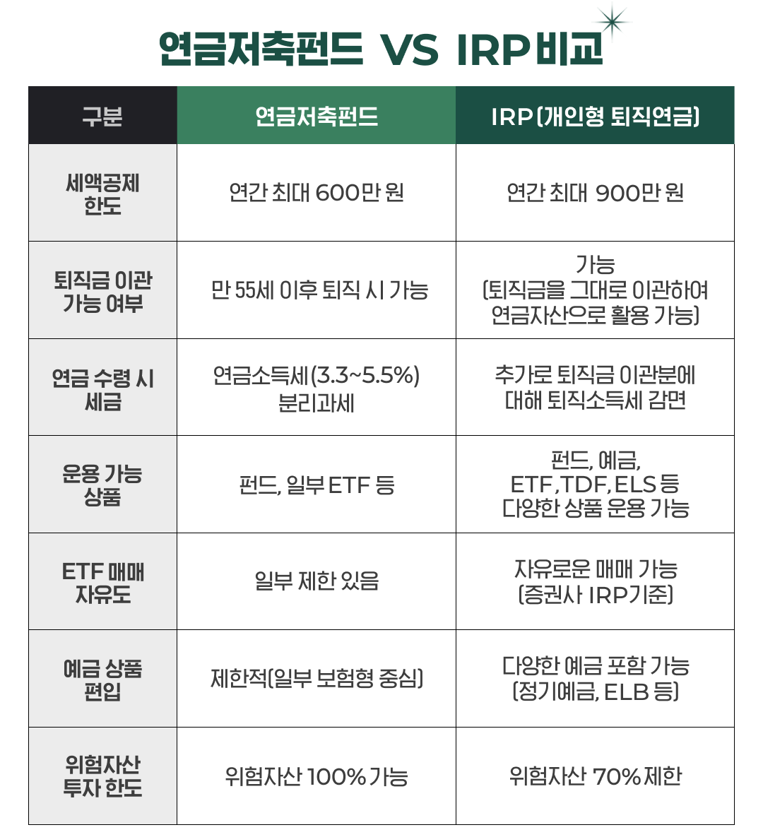 ๊ทธ๋ผ 50๋๊ฐ ๋น์ฅ ์ฐ๊ธ ์ค๋น๋ฅผ ์์ํ๋ค๊ณ ํ์ ์, ํ์ค์ ์ธ ๋ฐฉ๋ฒ์ผ๋ก๋ ์ด๋ค ๊ฒ ์์๊น์? ์์ ์ธ๊ธํ๋ IRP(๊ฐ์ธํ ํด์ง์ฐ๊ธ)๋ฅผ ๊ฐ์ฅ ๋จผ์ ๋ ์ฌ๋ ค ๋ณผ ์ ์์ด์. ์ฐ๊ธ์ ์ถํ๋์ ๋น๊ตํ์ ๋ ๊ณผ์ธ์ด์ฐ ํจ๊ณผ, ๋ถ๋ฆฌ๊ณผ์ธ ์ ์ฉ, ์ธ์ก๊ณต์ ๊ตฌ์กฐ ๋ฑ์ ๋์ผํ์ง๋ง, IRP๋ง์ ๊ฐ์ ์ด ๋๋ ทํ๊ธฐ ๋๋ฌธ์ธ๋ฐ์. ์ฐจ์ด๋ฅผ ๋น๊ตํด ๋ณผ๊น์?