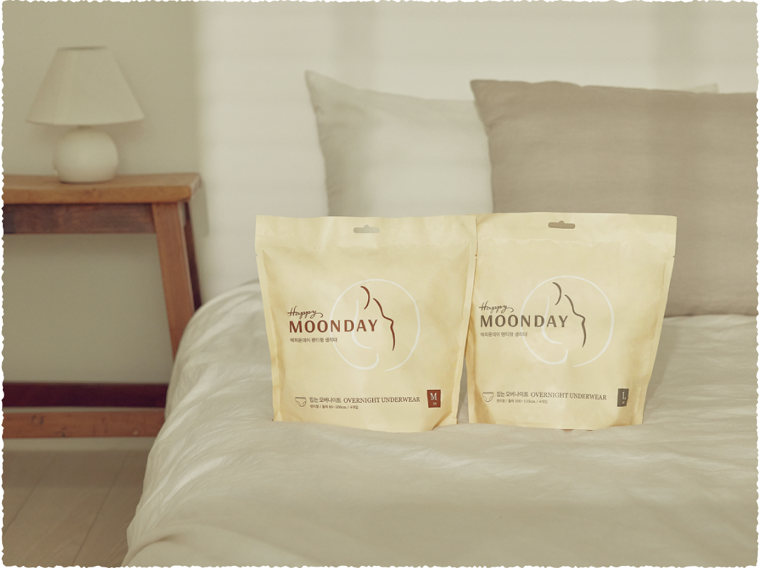 많은 분들이 기다리셨던 입는 오버나이트가 출시됐어요! 더 이상 잠자는 동안 월경혈이 샐까 봐 걱정하지 마세요. 마음 편히 달라진 아침을 맞이할 수 있어요. 양 많은 날, 오랜 시간 착용해야 하는 경우, 잘 때 뒤척임이 많은 사람에게 추천해요! 해피문데이 입는 오버나이트는 중형과 대형 2가지 사이즈예요. |