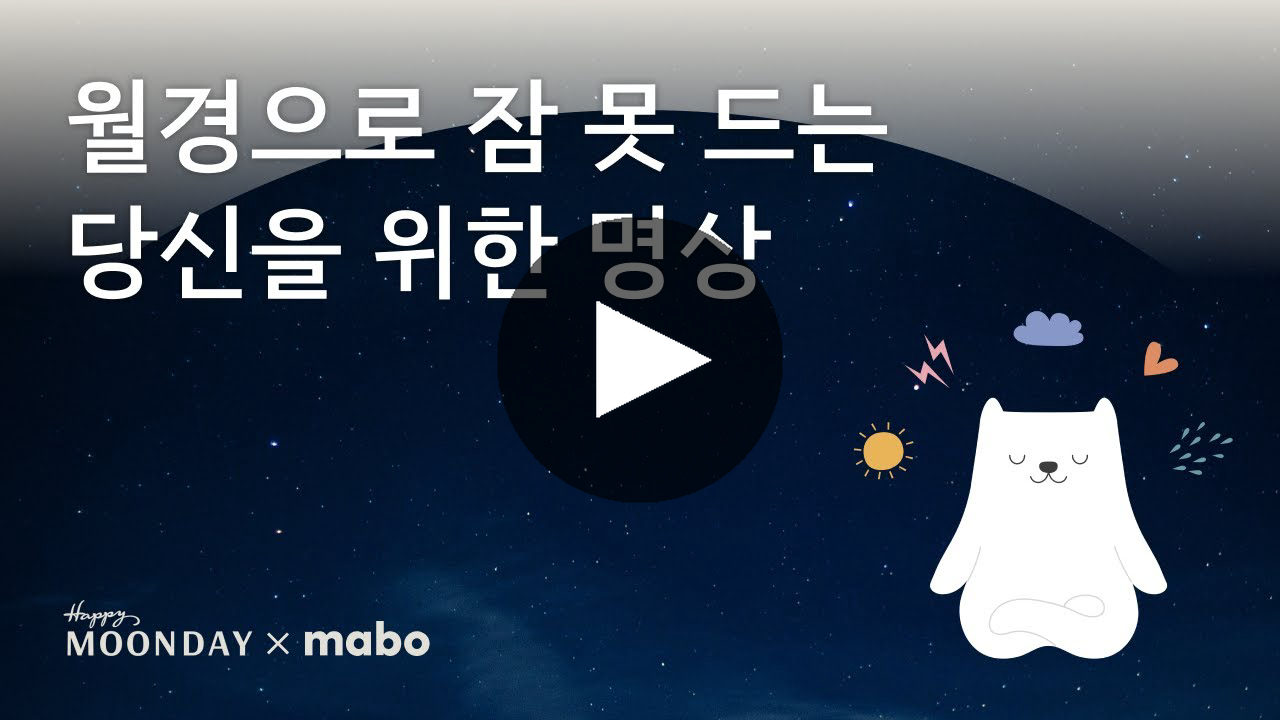명상 앱 마보와 함께 월경날 숙면을 위한 명상을 만들었어요. 영상을 즐겨찾기 해두고, 월경으로 몸과 마음이 지친 날 밤 들어보세요. 내 몸이 평소와 어떻게 다른지 느끼고, 내 기분의 변화를 발견해 보세요. 따뜻한 목소리를 들으며 마음이 편안해지고, 깊은 잠으로 빠져들 거예요. |