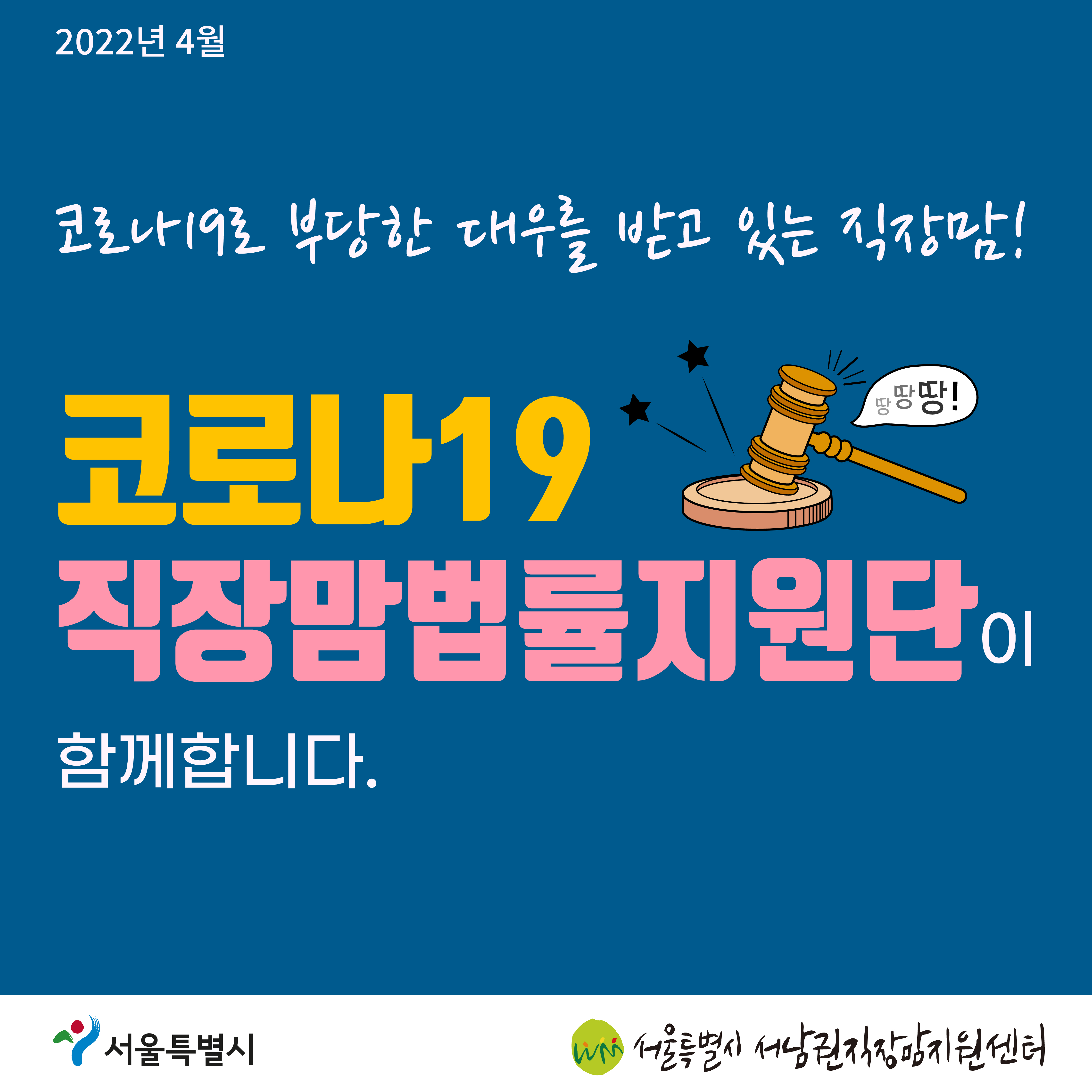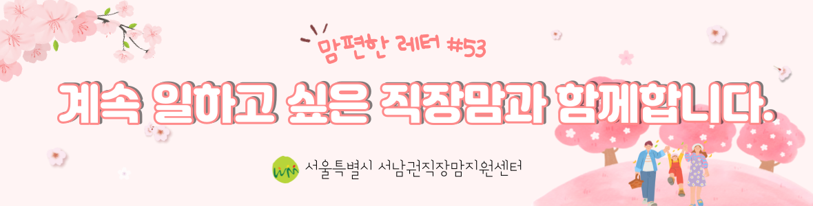 맘(mom)편한 레터 #53 (2022.04.15 발행) 안녕하세요, 서울시 서남권직장맘지원센터입니다!🥰 꽃이 활짝 피고 지며 따스한 봄을 알리는 4월입니다. 올해는 유난히도 겨울이 길어서 그런지, 다가온 봄이 더욱더 반갑게 느껴집니다🌸 이번 달의 뉴스레터에는 5월 노동법 먹고 샌드위치 먹고 심화/사업주 강의 신청, 고용노동부 '근로조건 자율점검' 항목 점검항목 개선 소식, 대체인력 지원금 소개, 이 달의 상담, 직장맘 성평등 카드뉴스, 코로나 19 법률지원단 카드뉴스, 업무협약 체결 소식과 오프라인 홍보전 내용을 담았습니다. 직장맘&대디에게 더 유익한 정보를 쉽고 간결하게 전달하기 위해 항상 노력하겠습니다. 뉴스레터에 대한 의견이 있으시다면 하단을 확인해주세요! 감사합니다 👀 5월 노동법 먹고 샌드위치 먹고 심화/사업주 교육 모집💌