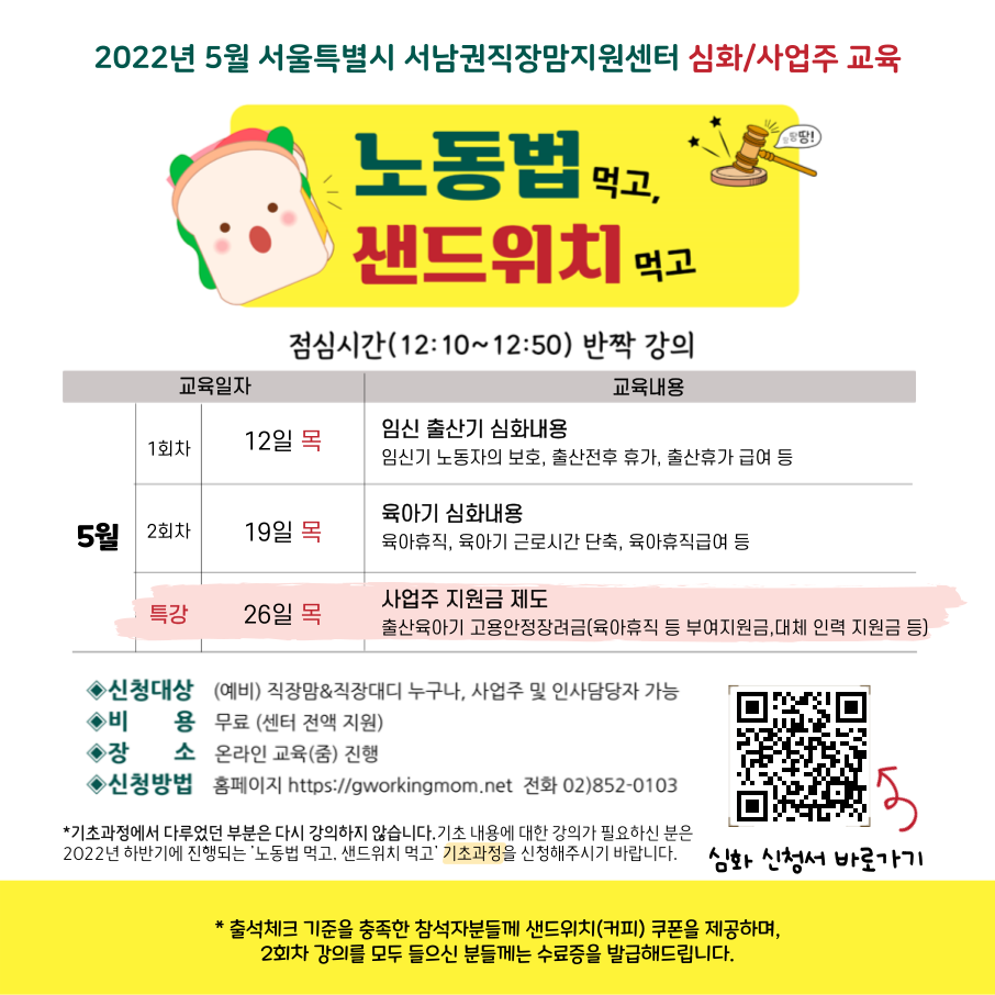 5월 심화 강의의 신청이 시작되었습니다! 이번 심화 강의는 기존 노동법 먹고 샌드위치 먹고 기초과정을 수강하신 분들 대상으로 실시되는 교육으로, 임신출산기와 육아기 심화내용을 더 자세히 배우실 수 있습니다. 점심 시간에 반짝✨ 진행되는 강의오니 기존에 기초를 수강했던 분들의 많은 참여 바랍니다! 5월 26일 목요일에 '노동법 먹고 샌드위치 먹고 사업주' 특강이 진행됩니다. 사업주 특강은 인사담당자 및 사업주를 대상으로 하는 강의로, 출산육아기 고용안정장려금 등의 사업주 지원금 제도로 구성되어 있습니다. 관심있으신 분들의 많은 참여 부탁드립니다. 하단의 링크를 클릭해주시면 바로 신청이 가능합니다 :) 👏서울시 서남권직장맘지원센터의 노력으로 고용노동부 '근로조건 자율개선' 점검항목 출산휴가&육아휴직 항목 재포함!💯