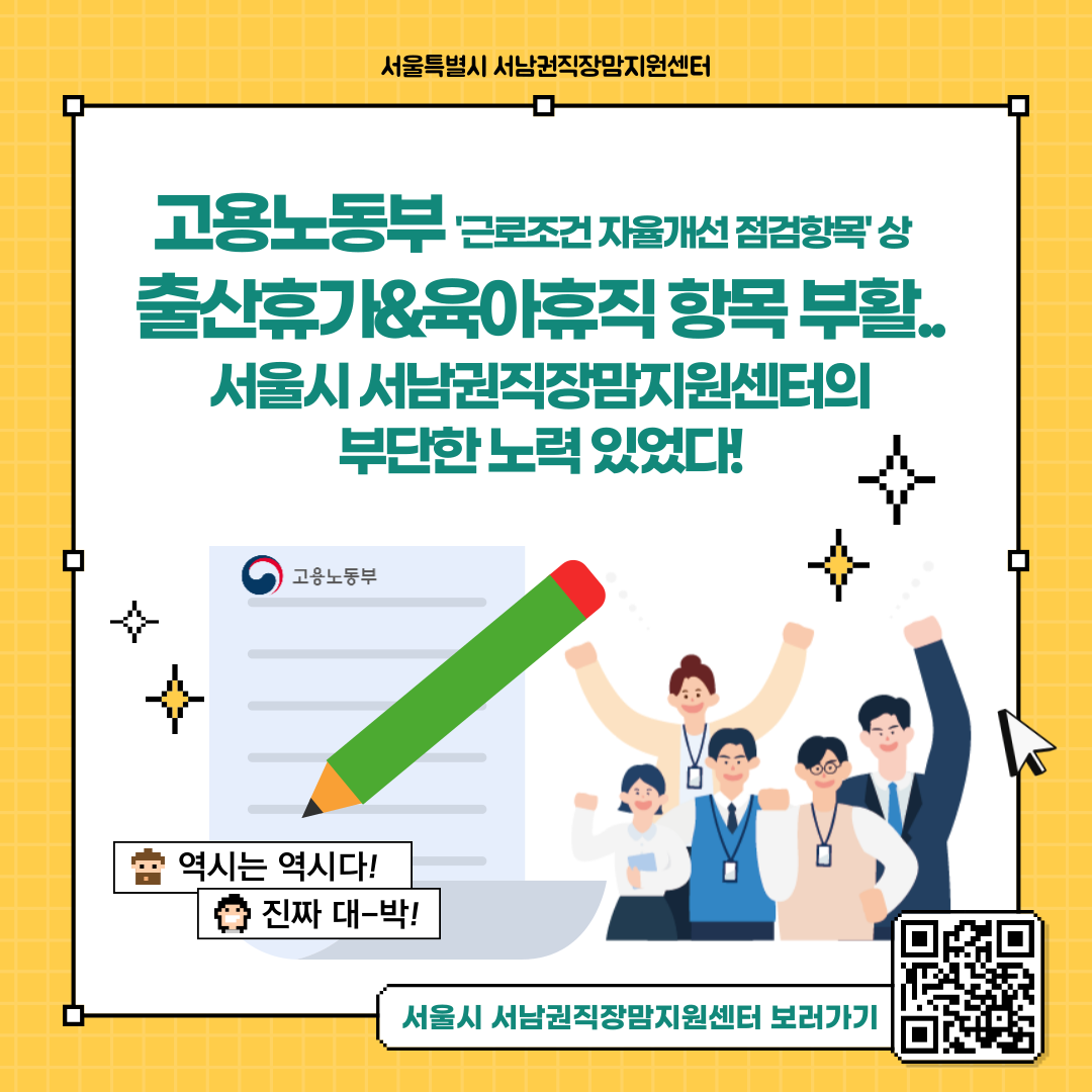 서울시 서남권직장맘지원센터는 고용노동부에서 실시하는 '근로조건 자율개선' 점검 항목 상 2017년 사라졌던 출산휴가와 육아휴직 항목을 다시 포함시키기 위해 노력하였고, 2022년 3월 21일, 고용노동부의 점검 항목에 해당 사항이 최종적으로 추가되었음을 확인하였습니다. 이는 사업장으로 하여금 출산휴가와 육아휴직에 대한 인지도를 높이고, 법령 기준을 다시금 확인시킬 수 있는 유의미한 성과입니다!💫 앞으로도 서울시 서남권직장맘지원센터는 직장내 여성들이 일과 가정의 균형을 이루며 자신의 일을 포기하지 않고 직장생활을 이어갈 수 있는 사회를 만들기 위해 더욱더 노력하겠습니다. 더 자세한 사항을 알고 싶으시다면 하단의 버튼을 클릭하셔서 카드뉴스를 확인해보세요! 모두가 함께 웃는 대체인력 지원금 😄〰
