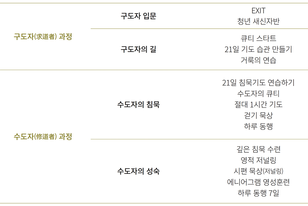 재가수도자훈련은 훈련자의 단계를 크게 구도자(求道者)와 수도자(修道者)로 나누어 진행된다. ‘구도자’(求道者)란 말 그대로 길(道) 되신 예수를 찾는 단계의 수련자를 지칭하고, ‘수도자’(修道者)는 그 길을 알고 길 되신 예수를 따라가고자 수련하는 이들을 말한다.