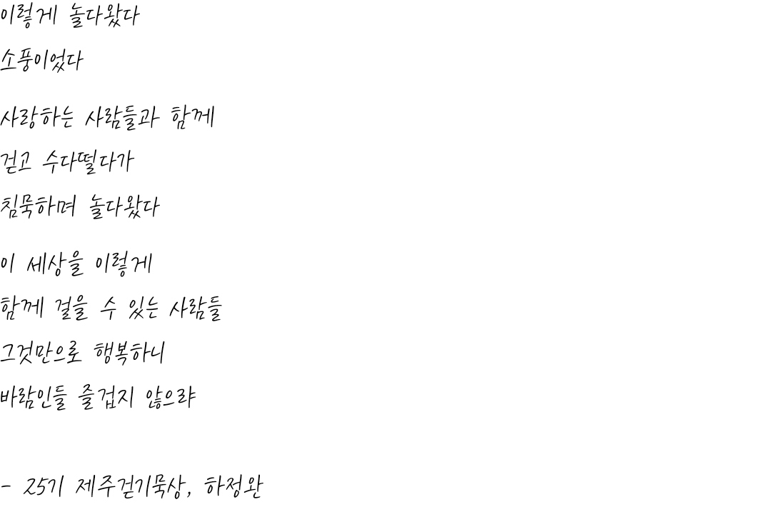 20대 때부터 지금까지 제주를 여러 번 가봤지만 눈뜬 소경처럼 제대로 보지 못했던 제주의 속 모습을 보게 해주셔서 감사드립니다.
