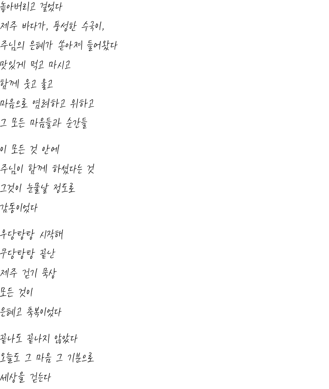 제주 걷기 묵상은 이미 와있는 천국을, 하나님을 가까이 경험하는 시간이었습니다. 말씀으로 하루를 열고 때로 침묵하며 아름답게 만드신 세상을 누리며, 사랑하는 사람들과 걷다가, 다시 하나님으로 돌아와 말씀 안에서 함께 쉬는 것. 완벽한 행복이었습니다.