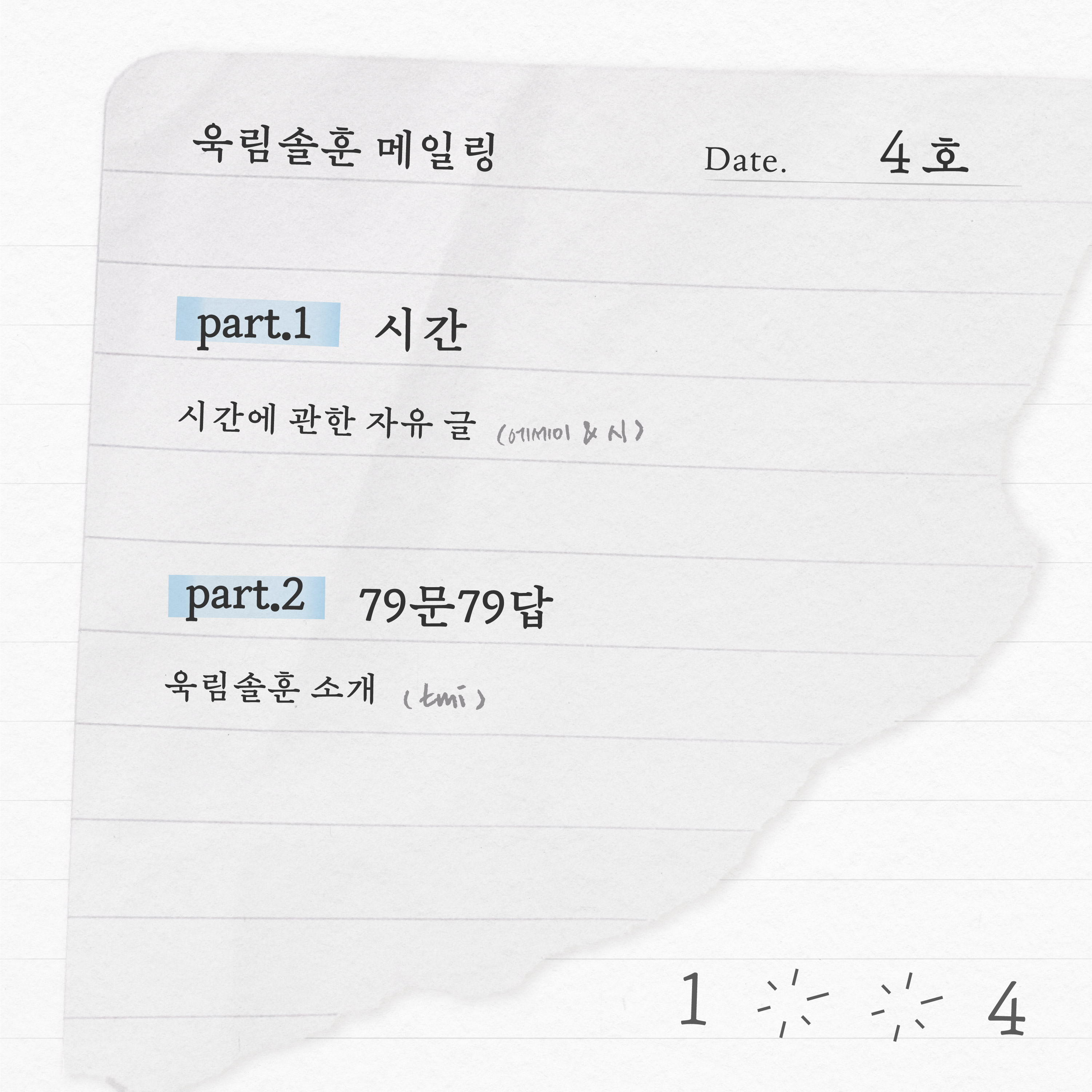 네 언제든 환영합니다! 메일 하단에 '쪽지 보내기'를 클릭하시어 하고 싶은 말을 남겨주셔도 좋고, 메일 또는 dm 보내주시면 됩니다. 1 0 0 4 독자분들의 감상과 피드백은 저희 욱림솔훈에게 나아갈 양분이 됩니다.