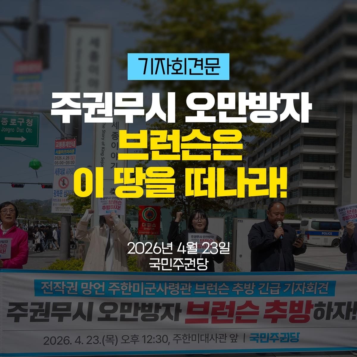 [생중계] 전작권 망언 주한미군사령관 브런슨 추방 긴급 기자회견 | 4/23(목) 오후 12시 30분, 주한미대사관 앞(광화문역 2번 출구 앞)