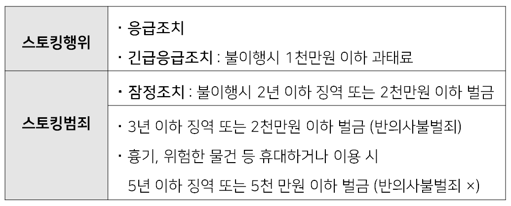 스토킹범죄에 대한 제재 스토킹행위가 지속적 또는 반복되는 경우에는 스토킹범죄가 된다고 말씀드렸는데요. 검사는 스토킹범죄가 재발될 우려가 있다고 인정하면 다음과 같은 <잠정조치>를 법원에 청구할 수 있고, 법원은 필요성이 인정되면 조치를 할 수 있습니다.
