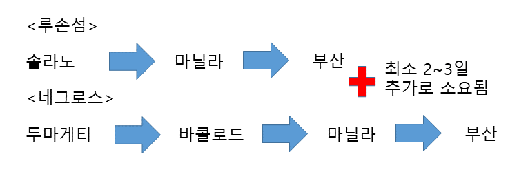 루손섬에서는 마닐라로 내륙운송을 한 이후 바로 부산으로 해상운송을 할 수 있었습니다. 그러나 네그로스섬에서는 두마게티 포장센터에서 바콜로드로 내륙운송을 한 다음, 마닐라로 해상운송을 한번 거치고, 마닐라에서 부산으로 향하게 됩니다.