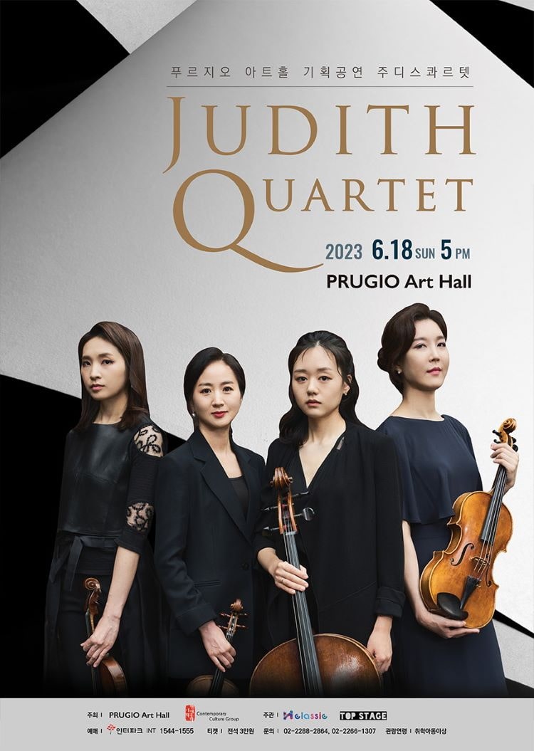 주디스콰르텟은 2016년 코리아챔버오케스트라(구 서울바로크합주단)의 상임단원들이 모여 창단한 현악 사중주단으로, 다년간 함께해 온 멤버들의 호흡을 바탕으로 견고한 음악세계를 구축하며 다양한 무대를 선보이고 있습니다. 멤버들은 제1바이올린에 박혜진 씨, 제2바이올린에 강보라 씨, 비올라에 유소람 씨, 첼로에 김수정 씨로, 이들은 모두 예원학교와 서울예고 동문이기도 합니다. 이번 공연에서는 모차르트의 디베르티멘토 1번 D장조, 하이든의 현악 사중주 ‘황제’, 베토벤 현악 사중주 7번 바장조 ‘라주모프스키’ 등을 들려줄 예정입니다.