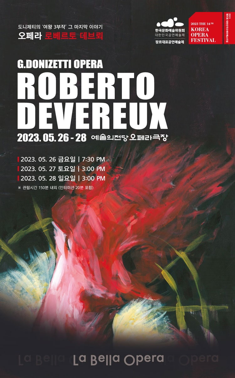<안나 볼레나>, <마리아 스투아르다>와 함께 도니제티의 ‘여왕 3부작’으로 나란히 언급되는 오페라 작품들 가운데 마지막 작품으로, 1837년 나폴리 산 카를로 극장에서 초연되었습니다. 라벨라오페라단은 2015년 <안나 볼레나>, 2019년 <마리아 스투아르다> 그리고 올해 <로베르토 데브뢰>를 한국에서 초연하며 8년 대장정의 마침표를 찍게 되었습니다. 소프라노 박연주, 손가슬 씨가 엘리자베스 여왕(작품 내에서의 이름은 엘리자베타) 역으로 더블 캐스팅되었고, 2019년 <나비부인>으로 대한민국오페라대상을 받은 김숙영 연출가가 이 공연의 연출을 맡았습니다.