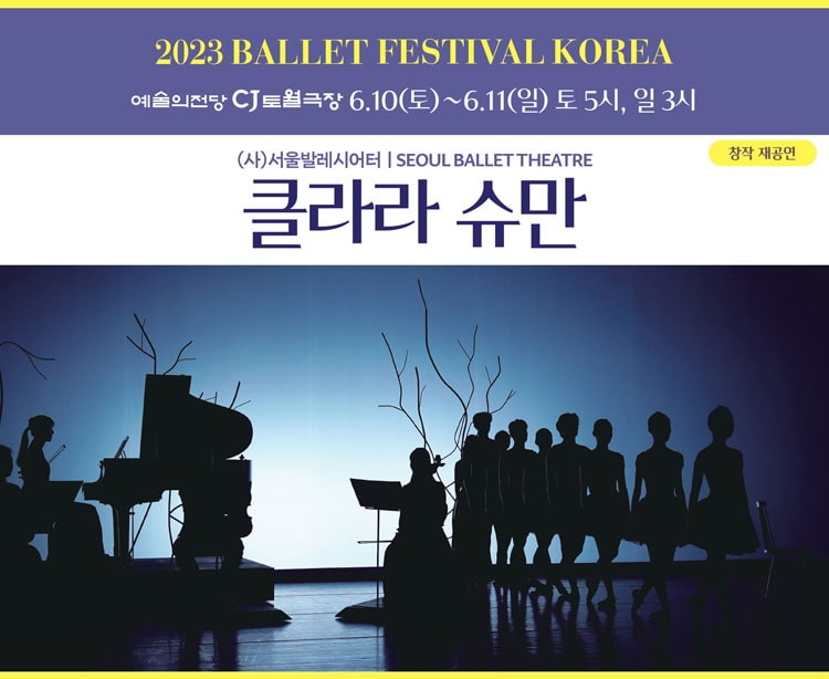 지난 2월 공연예술창작산실 올해의 신작 무대에 올려진 서울발레시어터의 <클라라 슈만>이 발레축제 참가작으로 다시 관객들과 만납니다. 서울발레시어터는 축제 무대에 앞서 지난 5월 19일과 20일 상주단체로 있는 구로아트밸리 예술극장에서 <클라라 슈만>을 공연한 바 있는데요, 단체의 주요 레퍼토리로 빠르게 자리잡아가고 있는 신작이 축제 관객들에게도 좋은 인상으로 남기를 기원합니다.