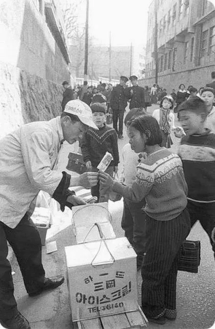 1940년대에는 소규모 제빙이 가능해지면서 색소를 탄 물에 설탕을 넣어 나무 막대를 꽂아 얼린 아이스케키를 파는 상인이 등장합니다. 아이스크림이라고 하기에는 빈약한 간식이었지만 이마저도 1937년 중일전쟁과 1941년 태평양전쟁으로 귀한 존재가 됩니다. 한국전쟁이 끝난 뒤에야 아이스케키가 번성하게 되죠. 나중에는 점차 발전해서 단팥과 우유물을 혼합한 아이스케키도 판매했어요.