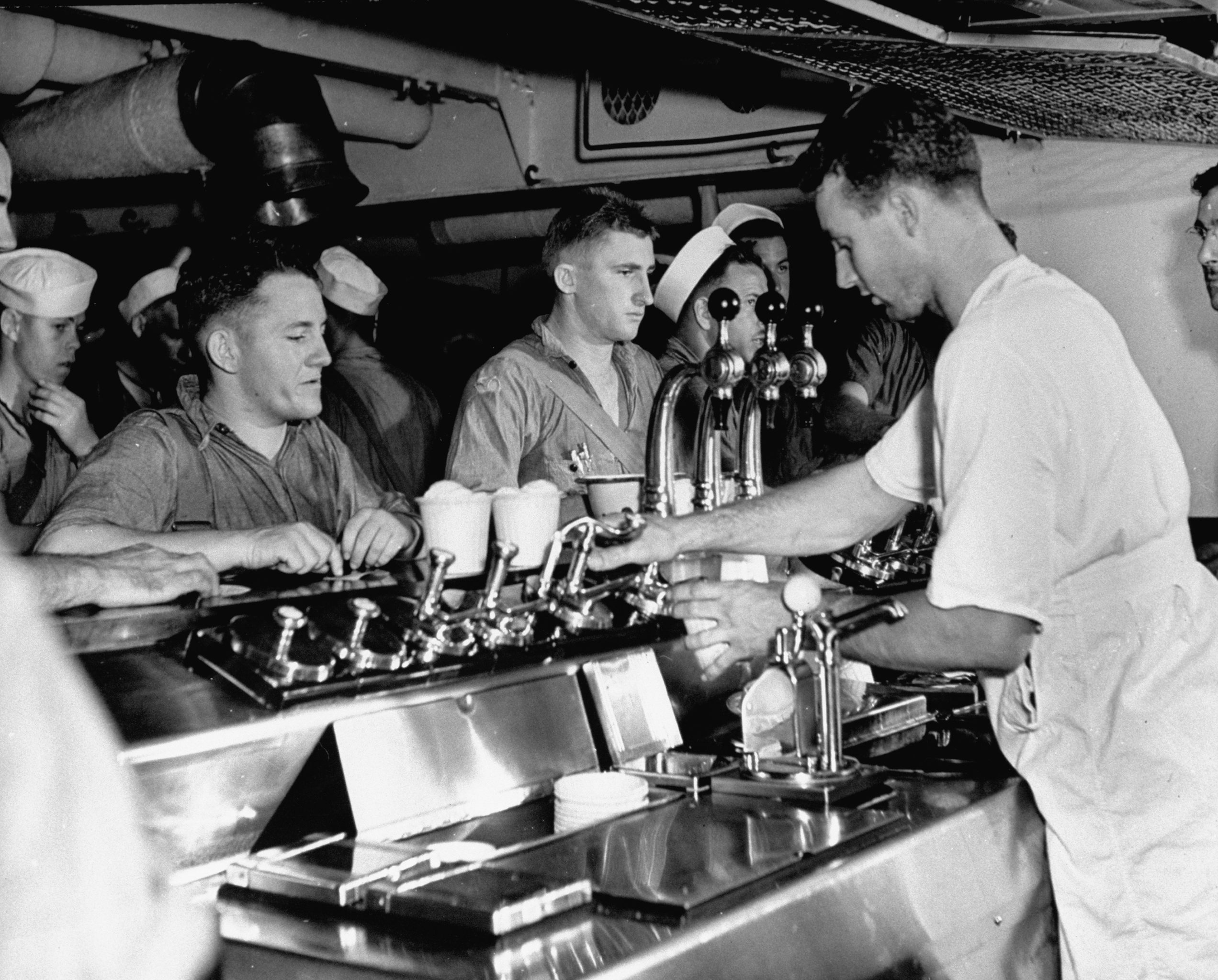 19세기 후반 미국에서 아이스크림은 주로 약국에서 판매했습니다. 소다 파운틴Soda Fountain 이라는 장치가 약국에 설치되어 소다수와 아이스크림과 소다수를 섞은 ‘아이스크림 소다’를 판매했기 때문이죠. 이는 소다수가 치유 효과가 있다고 여겨졌기 때문이에요. 1920년 금주법이 발효되자 소다파운틴의 인기가 더 높아지는데요. 술집을 운영하던 사람들, 심지어는 앤하이저부시Anheuser-Busch 와 같은 맥주 회사도 아이스크림 제조 및 판매로 업종을 바꾸었죠. 1933년 금주법이 폐지되기 전까지 소다파운틴은 미국 전역에서 볼 수 있었어요.