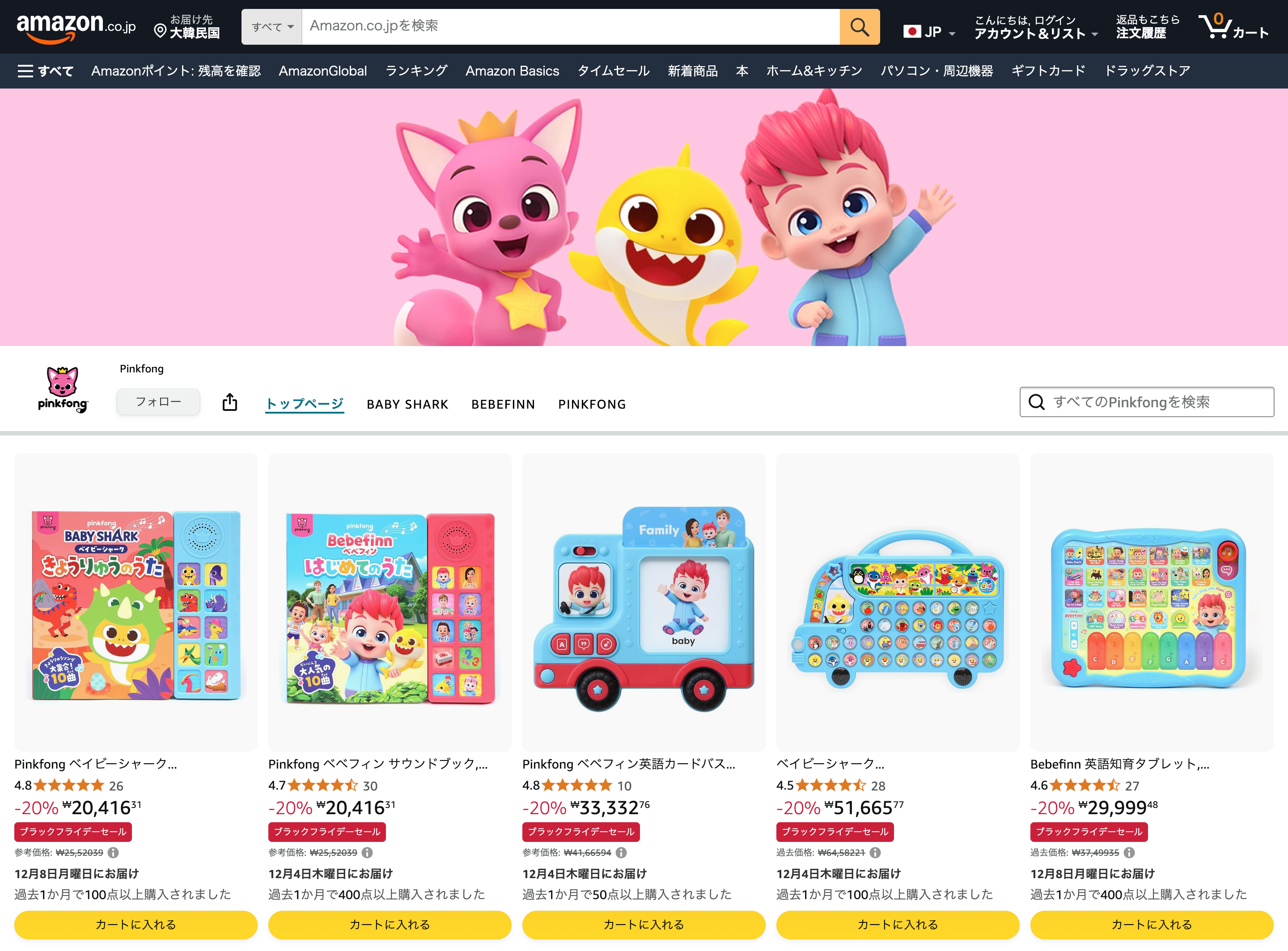 ピンクフォンカンパニーは、今年9月、アマゾンジャパンに「Pinkfong公式ブランドストア」をオープンしました。今回の出店により、新製品を含む主要製品をお届けできるだけでなく、日本国内配送により、日本のファンの皆さまがより便利に購入できる環境も整いました。公式ストアオープンから約2か月で、ピンクフォンカンパニーの新製品『べべフィンはじめての英語の歌知育タブレット』は、音楽玩具部門およびピアノ・キーボード楽器部門でランキング1位を獲得し、早くも大きな反響を示しています。その他にも、『べべフィンはじめてのうたサウンドブック』は外国語玩具部門で3位、『べべフィン英語カードバス』はフラッシュカード部門で6位にランクインするなど、さまざまな製品がベストセラーとして注目を集めています。学びにつながるおもちゃから遊んで楽しむおもちゃまで、今すぐアマゾンジャパンPinkfong公式ブランドストアで、さまざまなアイテムをチェックしてみませんか? |