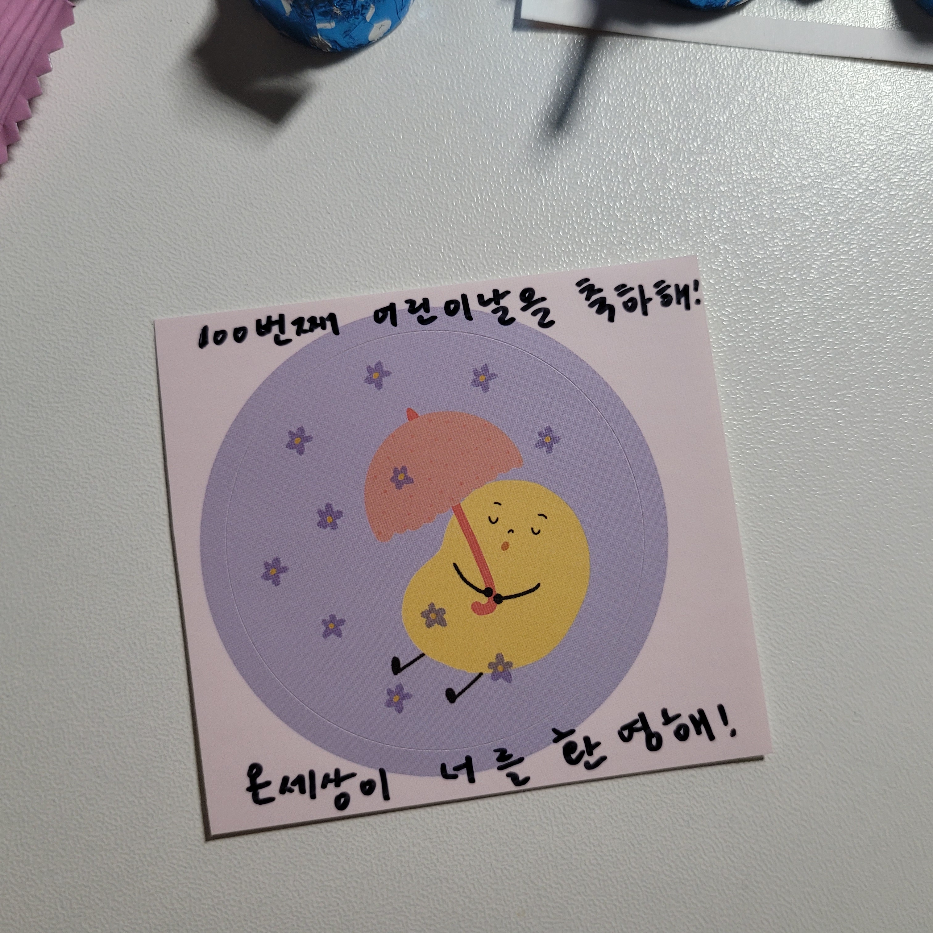 그럼에도 쥐어짜 낸 용기와 친구의 도움으로, 열두 명의 어린이에게 과자와 ‘100번째 어린이날을 축하해, 온 세상이 너를 환영해’라는 쪽지를 전할 수 있었어.