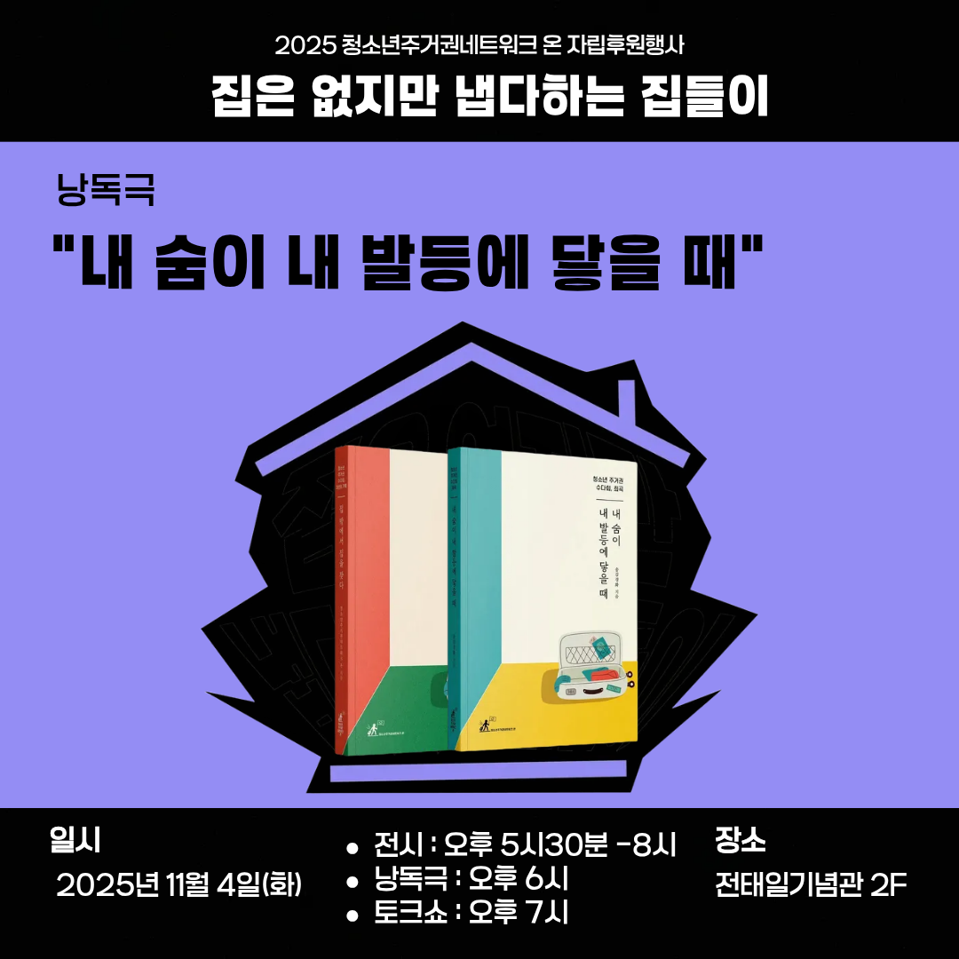 11월 4일, 온의 자립후원행사에서 제가 작업한 희곡 <내 숨이 내 발등에 닿을 때> 낭독극이 진행될 예정이에요. 집 밖에서 집을 찾아가는 청소년의 이야기를 멋진 분들이 오셔서 함께 낭독해 주시기로 했어요. 기대하셔도 좋습니다. 많은 분의 참여를 기대하며, 후원으로도 함께 해 주시길 부탁드려요.