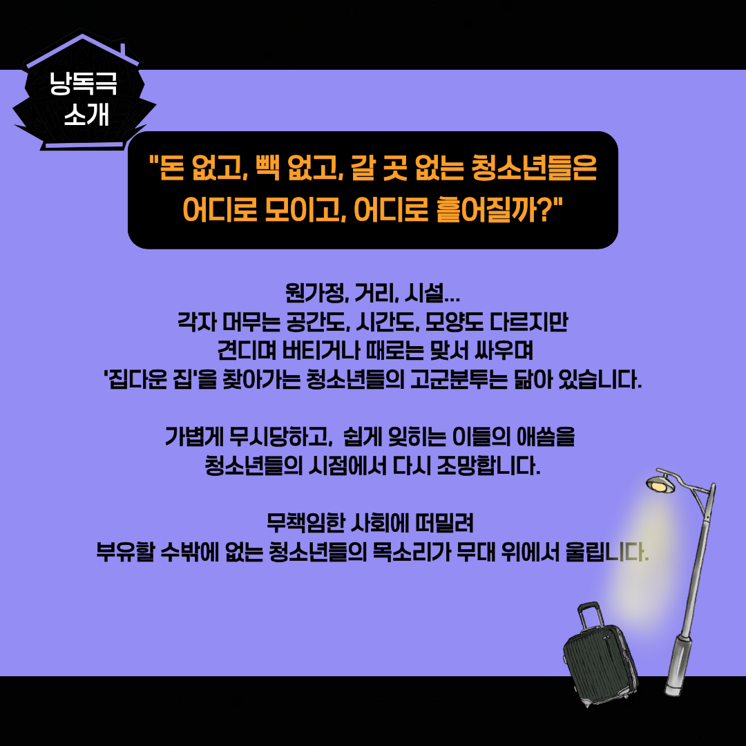 경화 : 원래 시설 얘기를 하려고 했던 건 아니고 청소년이 자립해서 살아가는 모습을 그리고 싶었거든요. 청소년의 자립에 대한 대안을 제시하는 작품을 하고 싶었어요. 그런데 우리 사회에 아직 청소년이 현실에서 다양한 시행착오를 경험하며 살아가는 모델이 너무 없는 거예요. 아직도 시설 중심으로 청소년을 지원하는 것이 여실히 드러난 거죠. 결국 청소년들이 가장 많이 이야기하는 시설에 관한 이야기를 다룰 수밖에 없었어요. 어쨌든 작품을 쓰면서 지금 청소년이 경험하고 살아가는 모습을 잘 드러날 수 있게 쓰고 싶었어요. 청소년이 살아가는 세상이 계속 어렵고 위험한데, 사회 구조의 문제를 잘 드러내고 설득할 수 있어야 한다고 생각했어요.
