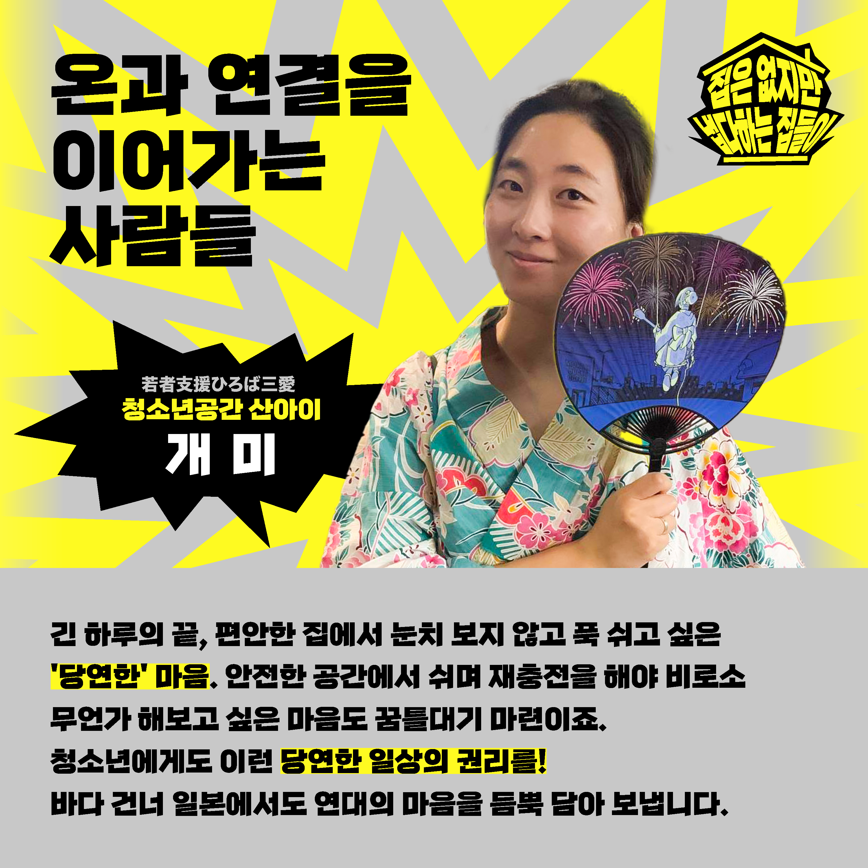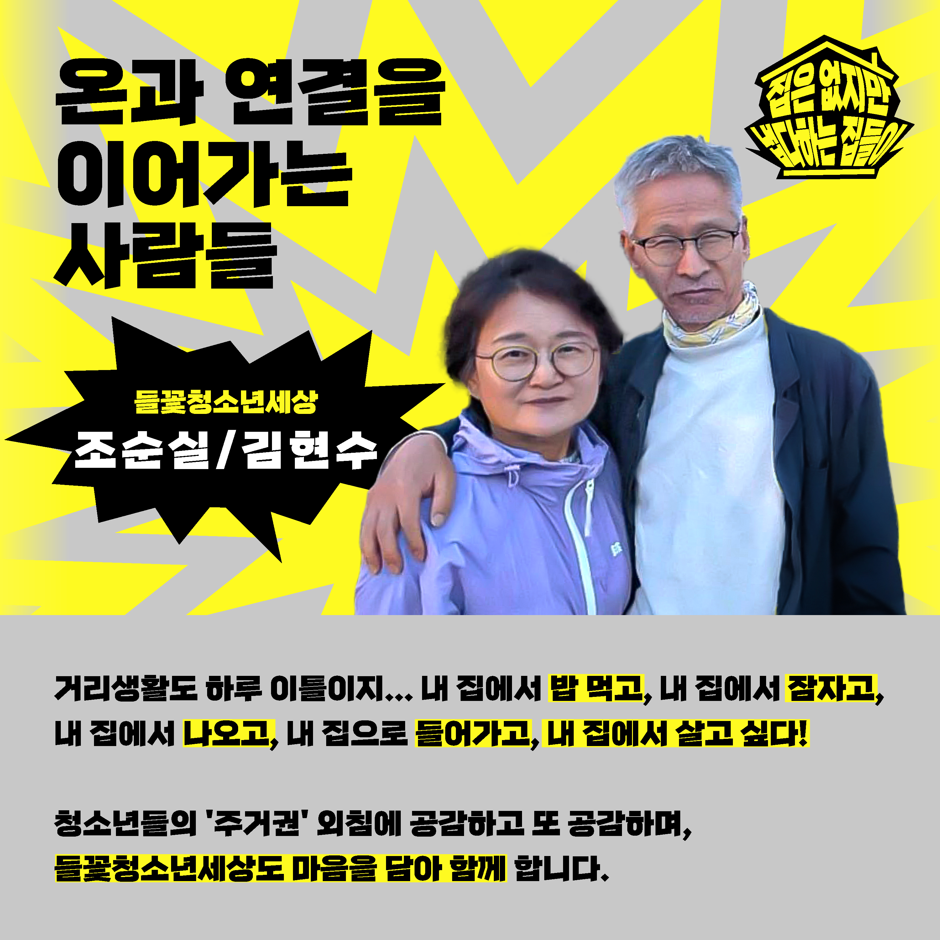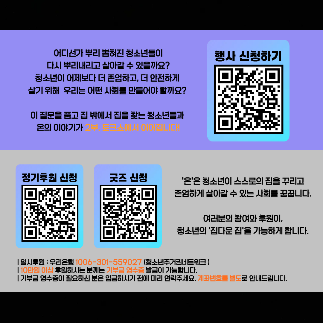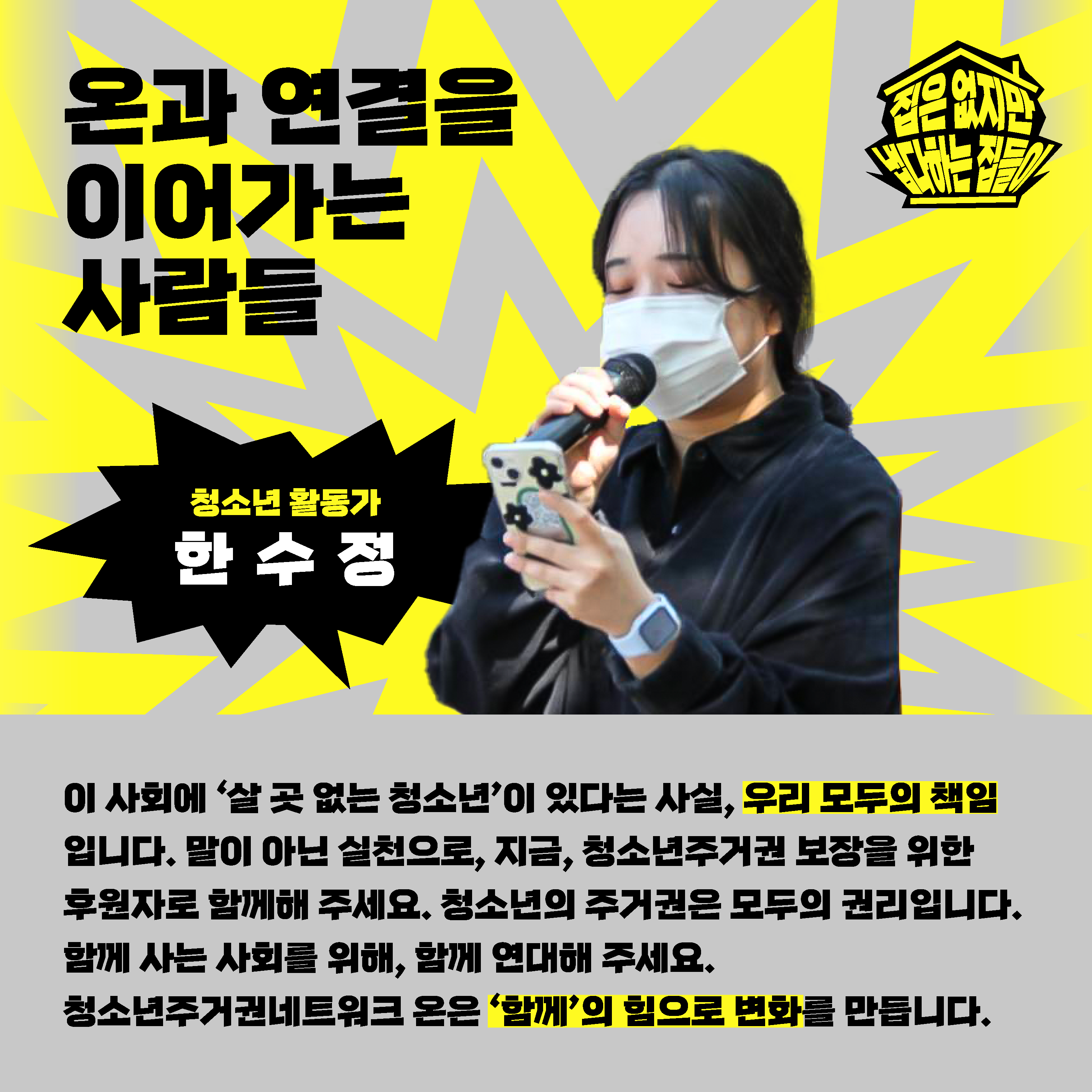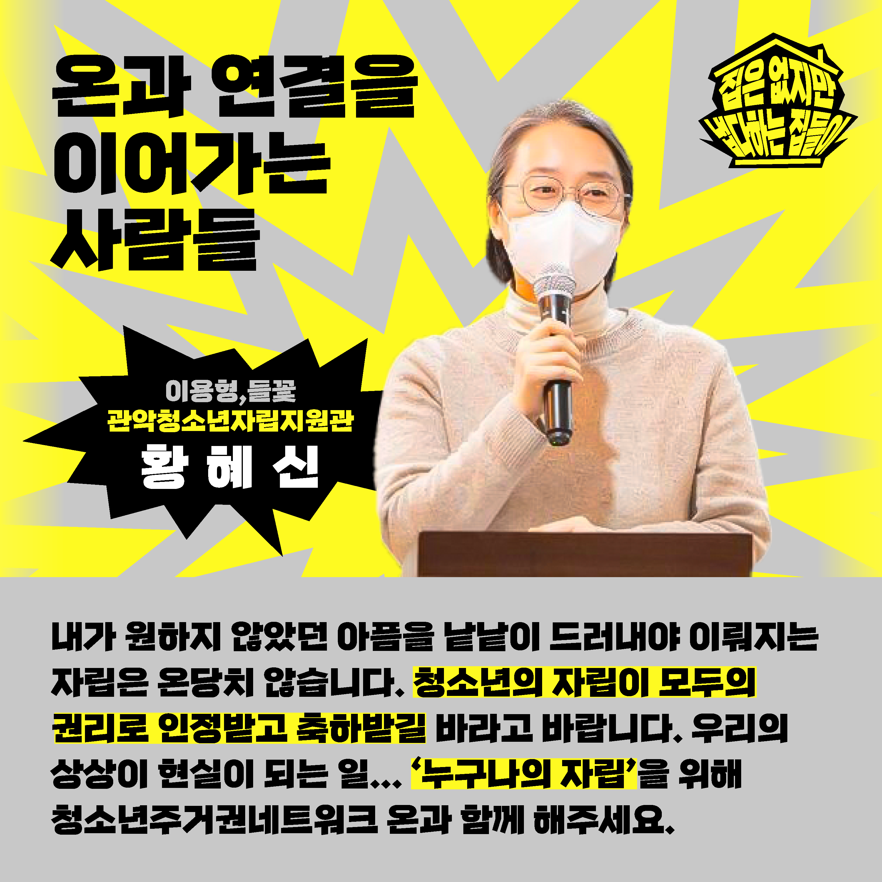 경화 : 온의 창립 이전부터 청소년주거권네트워크를 알고 있던 사람으로서 온이 얼마나 세심하고 사려 깊게 이 운동을 해 나가고 있는지, 말뿐이 아닌 청소년과 함께 살아가며 이 운동을 만들고 있는지, 그래서 이들이 만든 언어가 얼마나 아름다운지 모두 알았으면 좋겠어요. 그래서 이 운동을 지지하고 관심을 갖는 걸 넘어 이 운동에 후원해야 한다고 얘기하고 싶었어요. 이 일이 얼마나 고귀한 일인지 모두가 아셨으면 좋겠어요.