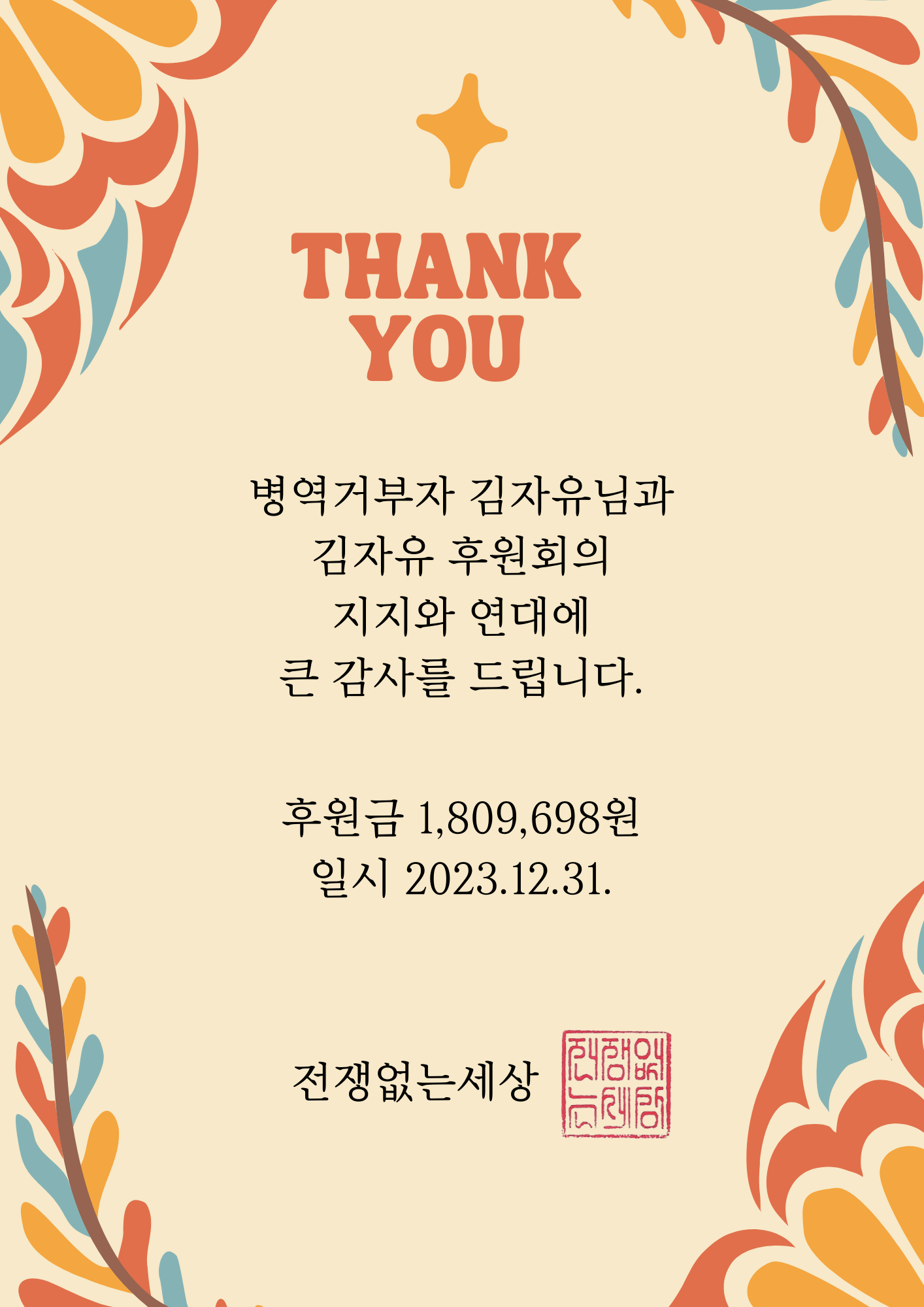 후원증서. 37분이 모아주신 1,809,698원을 전쟁없는세상에 기부하여 대체복무 제도개선 운동에 쓰였습니다. (PG 수수료 등 공제됨) |