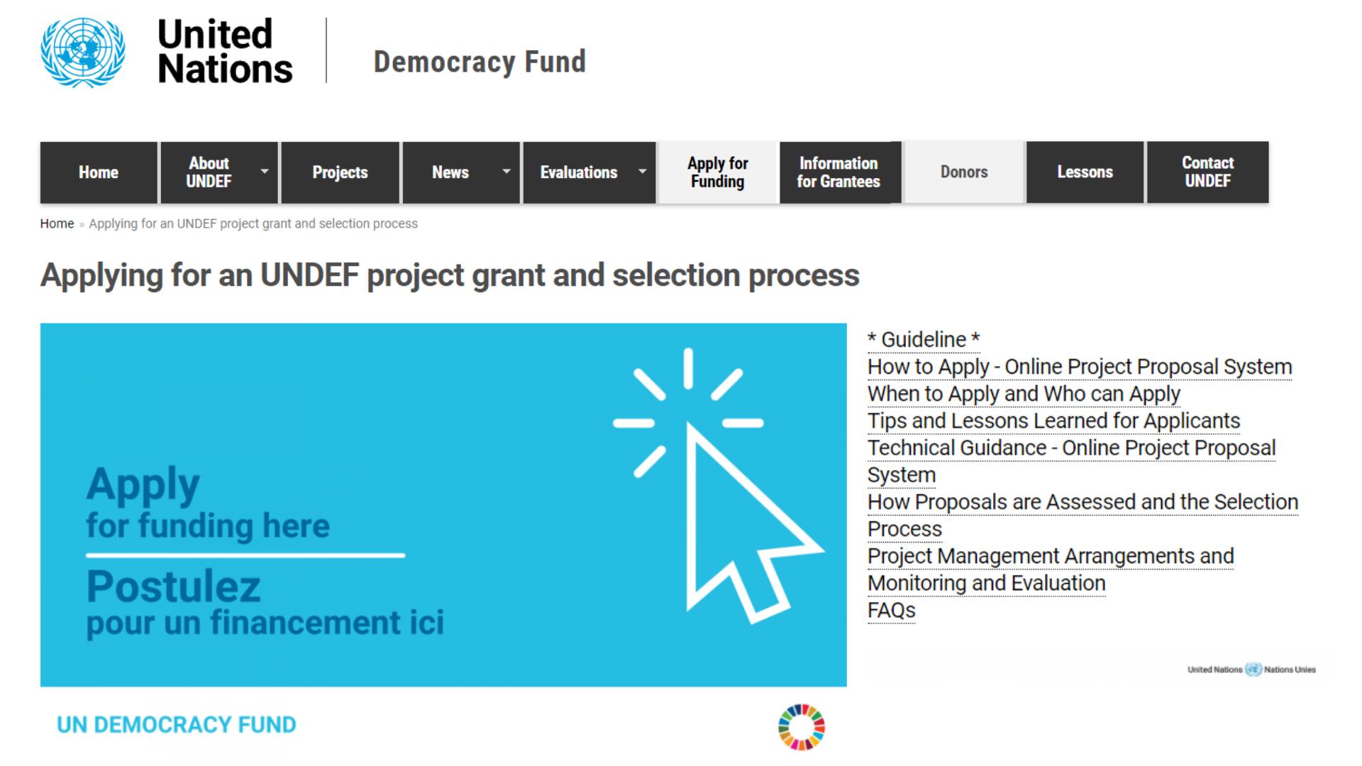 UN DESA NGO 지부의 요청으로, KCOC 사무처에서는 회원단체 여러분께 유엔 민주주의 기금(UNDEF)정보에 대해 안내 드립니다. 본 기금을 통해 시민사회는 2년간, 최대 250,000USD 규모의 프로젝트 지원을 받을 수 있습니다. 프로젝트 주제, 제안서 지침 및 관련한 자세한 사항은 아래 UNDEF 홈페이지를 통해 확인해 주세요.