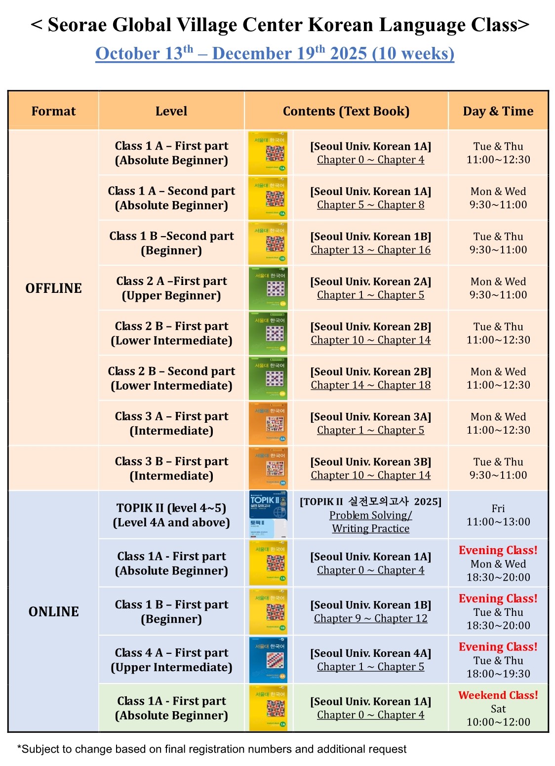 Please note that re-enrollment is not automatic at Seorae Global Village Center. You must register for each semester yourself after reviewing the available course offerings.