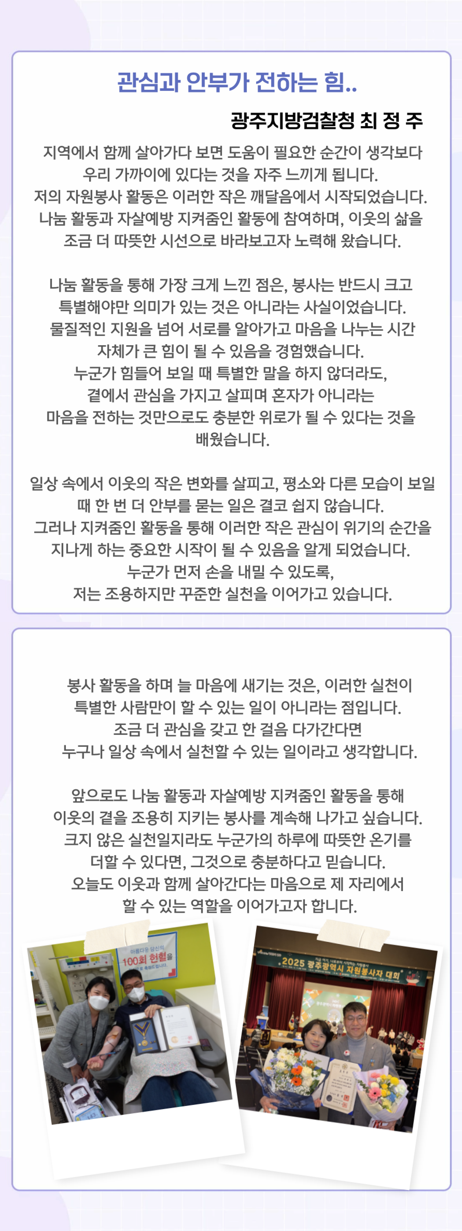이번 자원봉사 활동 수기는 2025년 광주자원봉사자대회에서 국무총리상을 수상하신 '최정주' 수사관님의 이야기를 소개합니다. 100회 이상의 헌혈과 자살예방 지켜줌인 활동 등 이웃의 곁을 지켜온 경험을 통해, 일상 속에서 누구나 실천할 수 있는 봉사의 의미를 전해주셨습니다. |