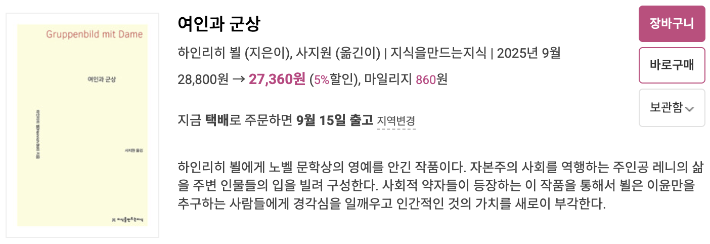 『카타리나 블룸의 잃어버린 명예』라는 작품으로 알고 있던 작가, 하인리히 뵐. 그에게 노벨문학상의 영예를 안긴 작품이라니, 저의 허영심과 호기심을 동시에 자극하는 책이군요(물론 노벨문학상은 특정 작품이 아니라 작가 전체의 문학 활동과 업적을 평가하여 주어진답니다).