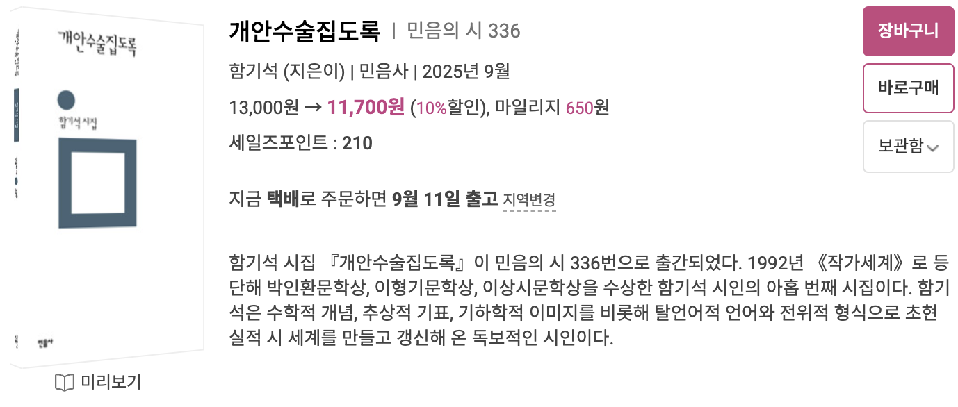 제목을 보자마자 장바구니에 담았습니다. 시집 제목이라서 그럴까요, 너무 재미있고 흥미로워 보였어요. 목차 또한 어마무시합니다. 「개안수술집도록 — 집도 제23」, 「개안수술집도록 — 집도 제24」, 「개안수술집도록 — 집도 제25」…….