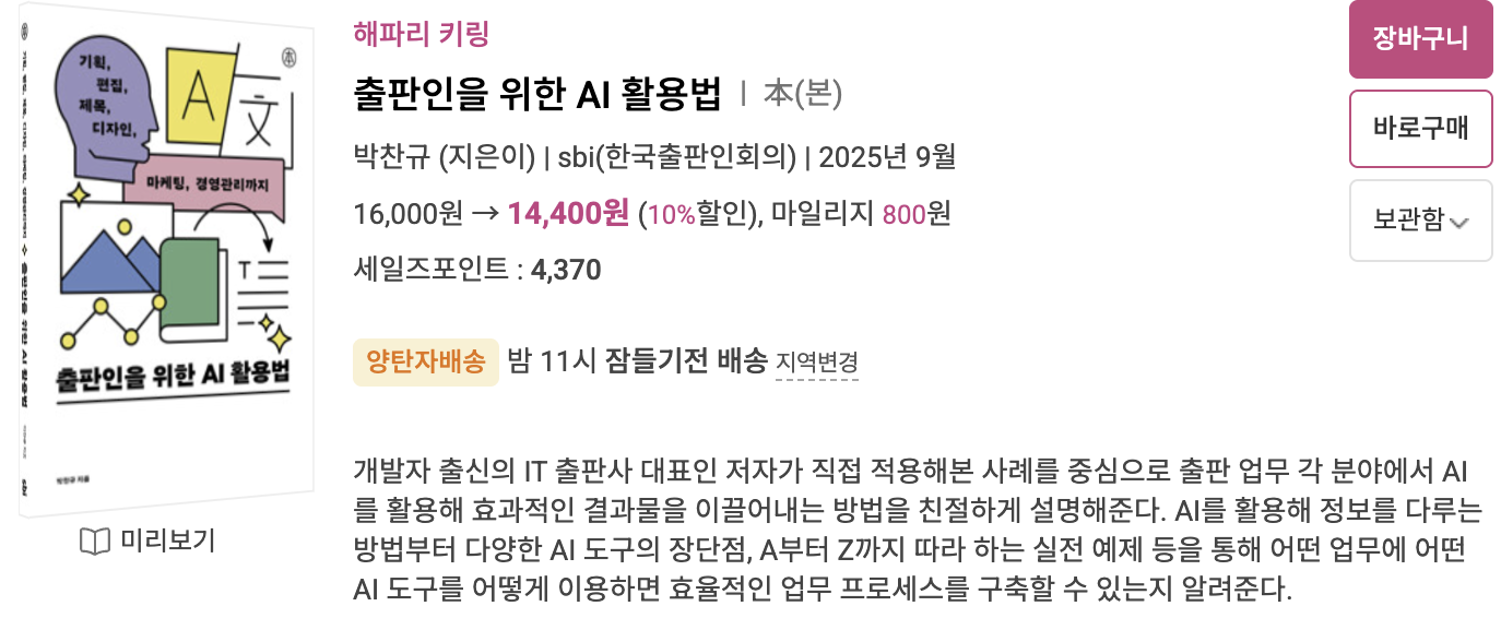 이 책에서는 자료 조사와 정리부터 문장 교정 챗봇(!) 만들기, 카드뉴스 제작 자동화, 판매 데이터 분석 등 출판 실무의 거의 모든 부분을 AI로 활용할 수 있는 방법이 담겨 있다고 하네요. 인력과 자원이 부족한 소규모 출판사로서는 AI를 똑똑히 활용하는 게 무엇보다 시급한 과제로 느껴집니다.