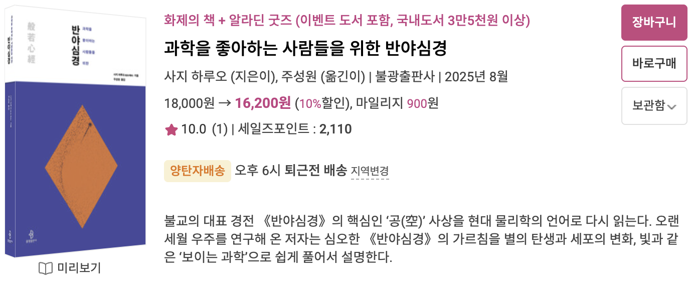 과학과 반야심경이라……. 대체 무슨 책일까 싶어 책 소개글을 읽어 보니 "불교의 대표 경전 『반야심경』의 핵심인 ‘공(空)’ 사상을 현대 물리학의 언어로 다시 읽는" 책이래요. 불광출판사는 불교 관련 서적을 참신하게 재해석해서 대중적으로 널리 알리는 데 탁월한 출판사인데요. 역시나 이 책도 무척 흥미로워 보이는군요.