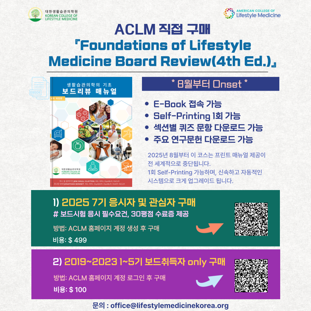 - 대상: 국제/한국 생활습관의학 보드전문자격증 취득자 또는 입문코스(LM101) 2/3 이상 수강자
