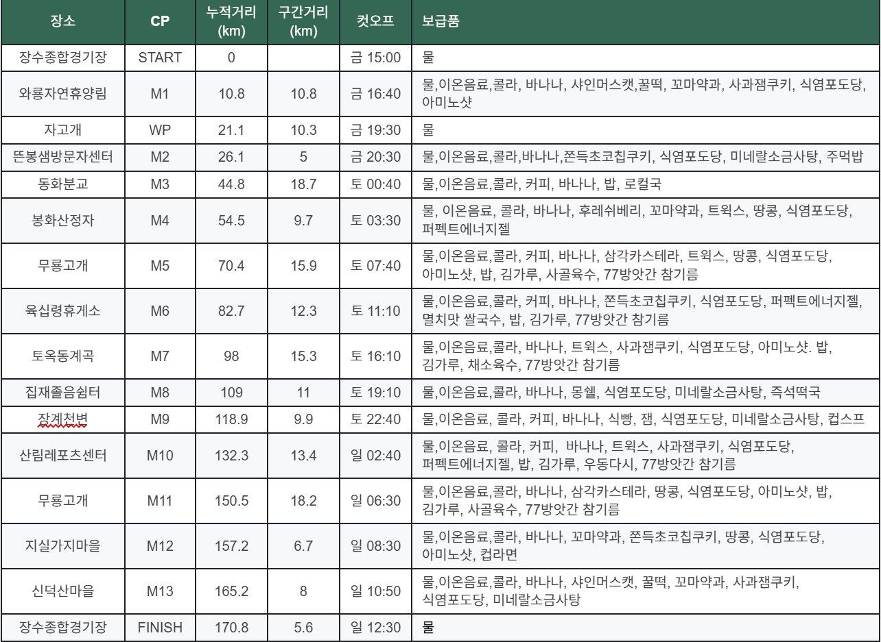 - CP마다 제공되는 보급품을 미리 확인하고 본인 컨디션에 맞춰 섭취 계획을 세우시면 완주에 큰 도움이 됩니다.