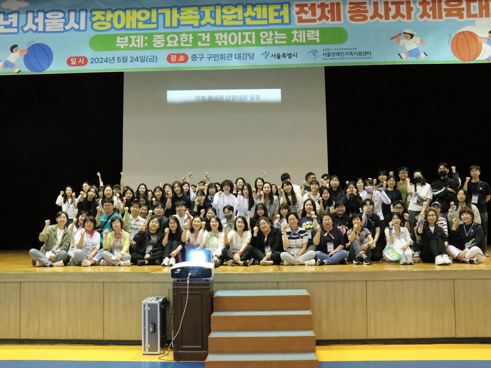 약 100여명의 서울시 장애인가족지원센터 종사자들이 전체 종사자 체육대회를 위해 한자리에 모였습니다. 축구다트, 바람잡는 특공대, 외나무다리 대결 등 다양한 체육경기를 통해 전체 종사자들의 화합과 친목을 다지는 뜻 깊은 시간이었습니다.