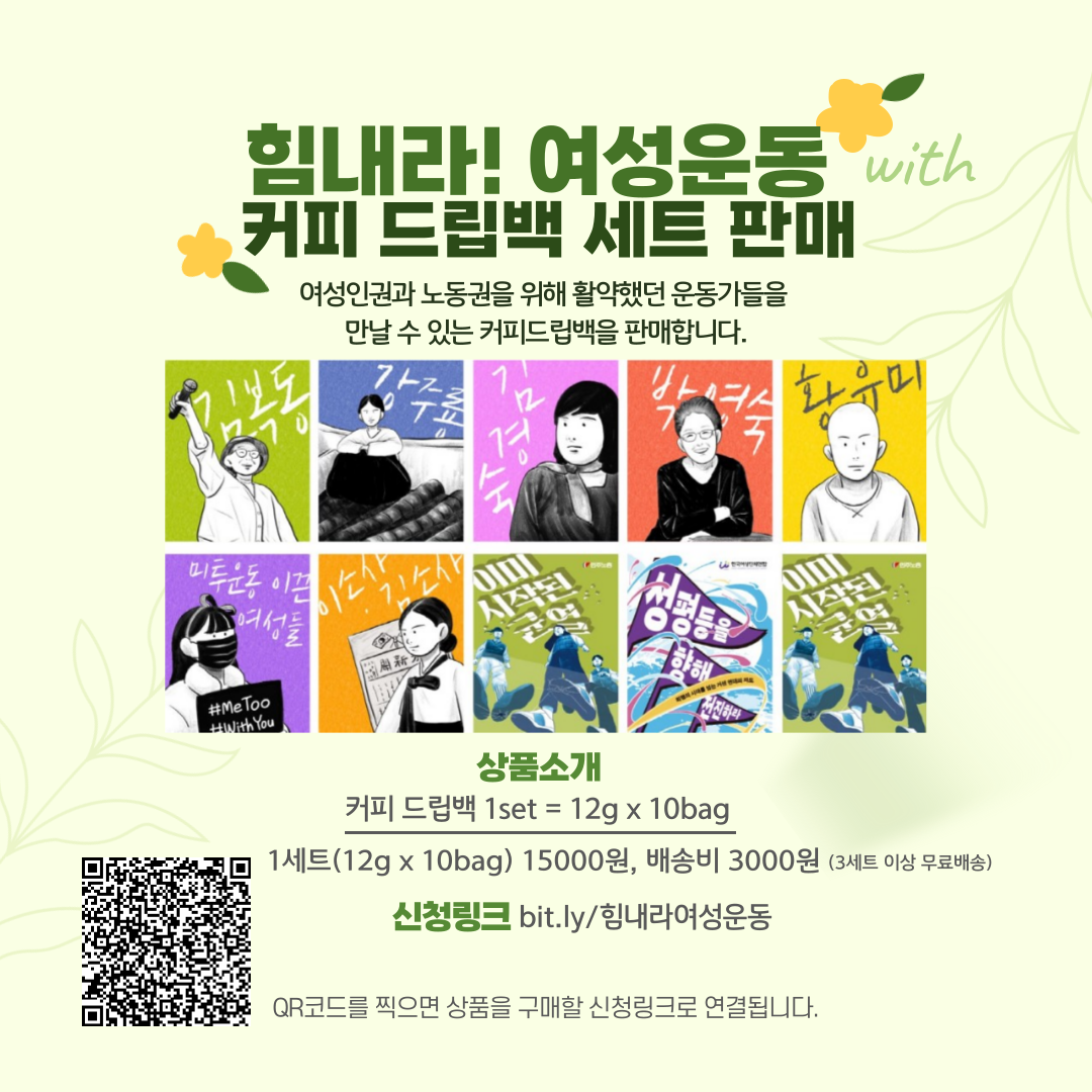 여성인권과 노동권을 위해 활약했던 운동가들을 만날 수 있는 커피드립백을 판매합니다. 3.8세계여성의 날 기념으로 판매했던 커피 드립백 세트를 연중 판매하고 있습니다.