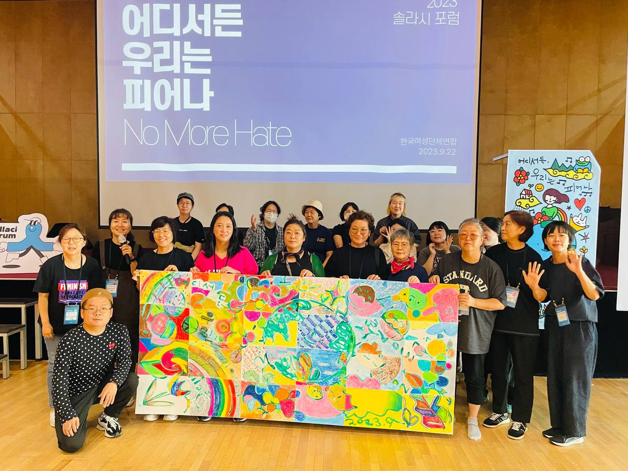 여성연합은 9월 21일(목)~23(토) 2박 3일 동안 충남 공주 한국문화연수원에서 열린 솔라시 포럼에 참여했습니다. 전국 다양한 영역에서 활동하고 있는 활동가들의 만남과 교류의 장이었던 솔라시 포럼에서 여성연합은 연중 캠페인 '어디서든 우리는 피어나 - No more hate' 프로그램을 진행했습니다. 신주욱 작가의 드로잉 퍼포먼스와 활동가들이 함께 그리고 완성한 캠페인 메인 이미지, 활동가들이 각 영역에서 소망하며 이루고자 하는 더 나은 세상에 대한 바람을 나누는 자리였습니다. |
