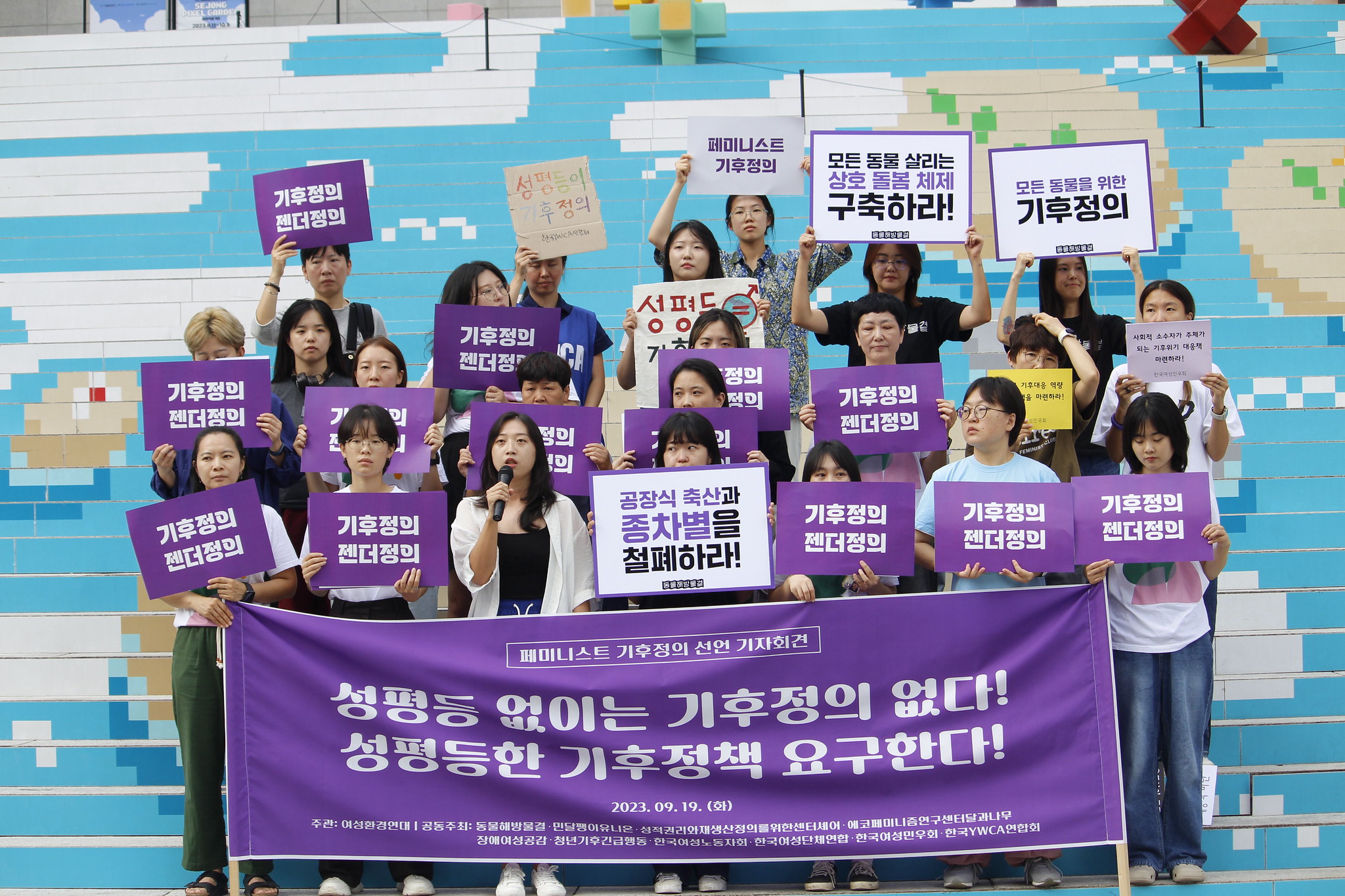 9월 19일(화) 오전 10시 여성연합은 여성환경연대, 동물해방물결, 민달팽이유니온, 성적권리와 재생산정의를 위한 센터 셰어 SHARE, 에코페미니즘연구센터달과나무, 장애여성공감, 청년기후긴급행동, 한국여성노동자회, 한국여성민우회, 한국YWCA연합회 등 총 10개의 단체와 함께 페미니스트 기후정의 선언문과 10대 요구안을 발표했습니다. 생태계를 파괴하고 모두의 삶을 벼랑 끝으로 내모는 이 위기의 시대에 근본적인 해결책을 마련하기 위하여 11개 단체는 여성, 청년, 성소수자, 비인간동물을 모두 포함한 페미니즘의 관점이 기후정의 담론의 주요 의제가 되어야 한다는 공통의 인식을 가지고 2023년 4월부터 8월까지 수차례의 논의와 토론을 거쳐 페미니스트 기후정의 선언문과 페미니스트 기후정의 원칙을 수립했습니다.