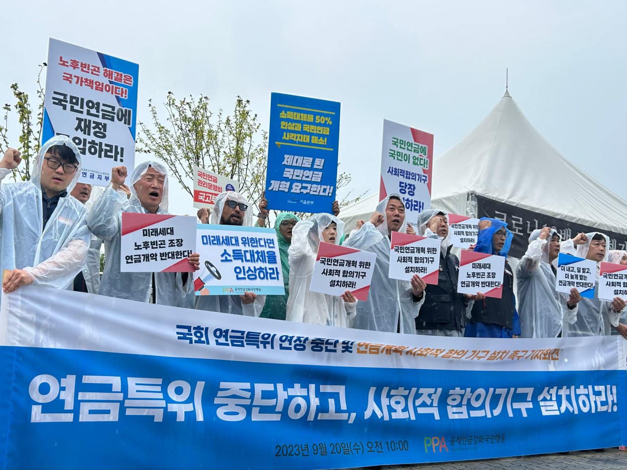 9월 20일(수) 오전 10시 국회 정문 앞에서 공적연금강화국민행동이 국회 연금특위 연장 중단 및 연금개혁 사회적 합의 기구 설치 촉구 기자회견을 개최했습니다. 국회 연금특위는 자문위의 전문가를 중심으로 연금개혁을 논의했지만, 올해 초 이미 모수개혁에 대한 단일안 도출에 실패했습니다. 지난 9월 1일 제5차 재정계산 공청회에서도 재정안정론에 편향되고 소득대체율 상향이 배제된 반쪽자리 보고서가 발표되었습니다. 가입자를 배제한 전문가만의 연금개혁 논의는 한계에 다다랐습니다. 연금개혁의 당사자가 결국 실마리를 풀어야 합니다. 실패로 귀결될 수 밖에 없는 전문가 중심의 연금개혁 논의를 중단하고, 이제 연금개혁을 위한 사회적 합의를 추진해야 합니다.