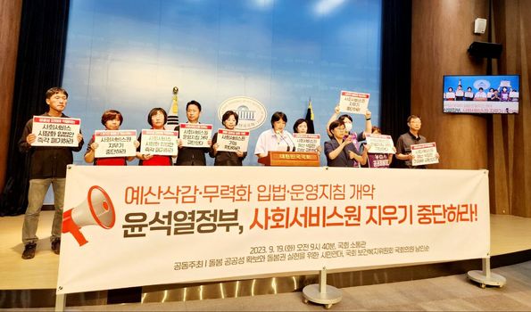 9월 19일(화) 오전 9시 40분 국회 소통관 기자회견장에서 윤석열 정부의 사회서비스원 지우기 정책 중단 촉구 기자회견이 열렸습니다. 윤석열 정부의 사회서비스원에 대한 공격이 날로 거세지고 있습니다. 지자체에서는 사회서비스원의 통폐합이 이루어지고 있고 예산 삭감을 핑계로 사업이 축소되고 종사자의 해고가 이어지고 있는 상황입니다. 이런 와중에 지난 8월, 정부는 국회에 제출할 2024년 예산안에서 사회서비스원 운영 예산 중 지자체보조금 148억 3400만원을 삭감했습니다. 또한 정부는 지난 9월 1일 사회서비스원 운영지침을 개정하며 사회서비스원의 공적 역할을 대폭 축소했습니다.