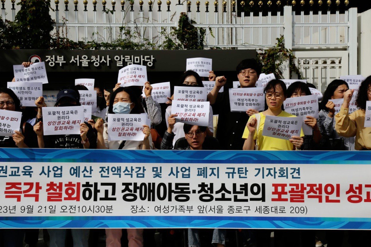 9월 21일(목) 오전 10시 30분 서울 정부청사 앞에서 여성가족부 장애아동・청소년 성인권교육 사업 폐지를 반대하는 111개 장애/청소년/여성/인권/시민사회단체가 기자회견을 개최했습니다. 여성가족부는 9월 7일 설명자료를 통해 2013년부터 10년간 진행한 비장애 학생과 장애학생이 참여하는 ‘성인권교육’ 사업 예산을 전액 삭감/폐지하겠다는 입장을 밝혔습니다. 「학교보건법」에 따른 의무교육으로서의 폭력예방교육과 보건복지부에서 진행하는 발달장애인 성교육과의 유사・중복성, 지자체 수요 감소가 그 이유입니다. 지자체 수요 감소는 그 근거가 명확하지 않으며 여성가족부는 10년간 지자체와 해당 사업에 대한 소통과 논의를 전혀 하고 있지 않았습니다.