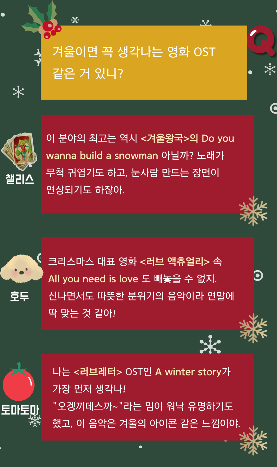 겨울이면 떠오르는 영화 속 음악들❄🎶 여러분들은 겨울 하면 떠오르는 영화가 있으신가요? 아무래도 겨울은 크리스마스, 연말, 새해와 같이 가슴 설레는 날들이 많이 있다보니 이와 관련된 영화나 음악들도 많은 것 같아요. 그래서 이번 뉴스레터의 주제에 맞춰 겨울 하면 떠오르는 영화 OST에 대해 저희 에디터들끼리 이야기를 나눠봤어요! 연말에는 겨울 느낌 가득한 영화 속 OST로 여러분의 플레이리스트를 장식해보는 것은 어떠실까요?🎶